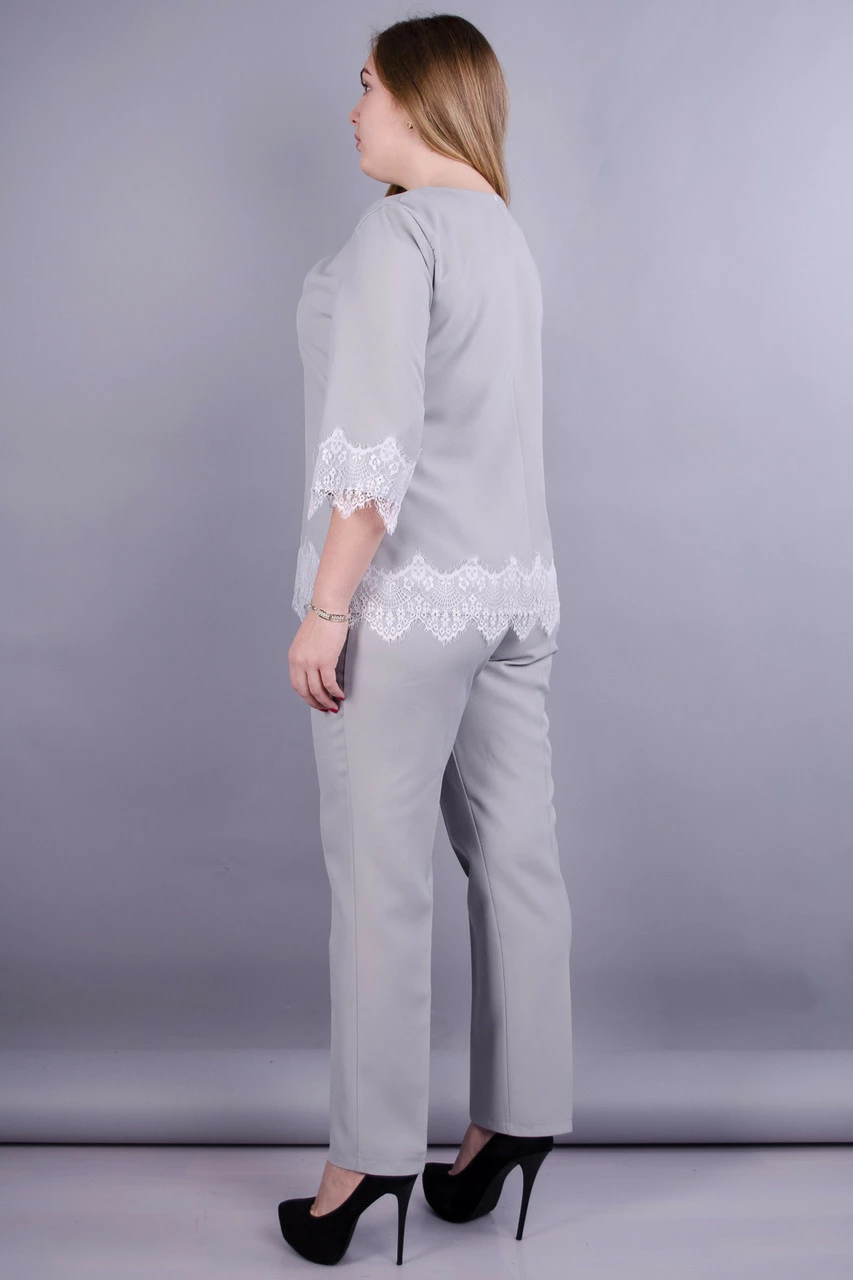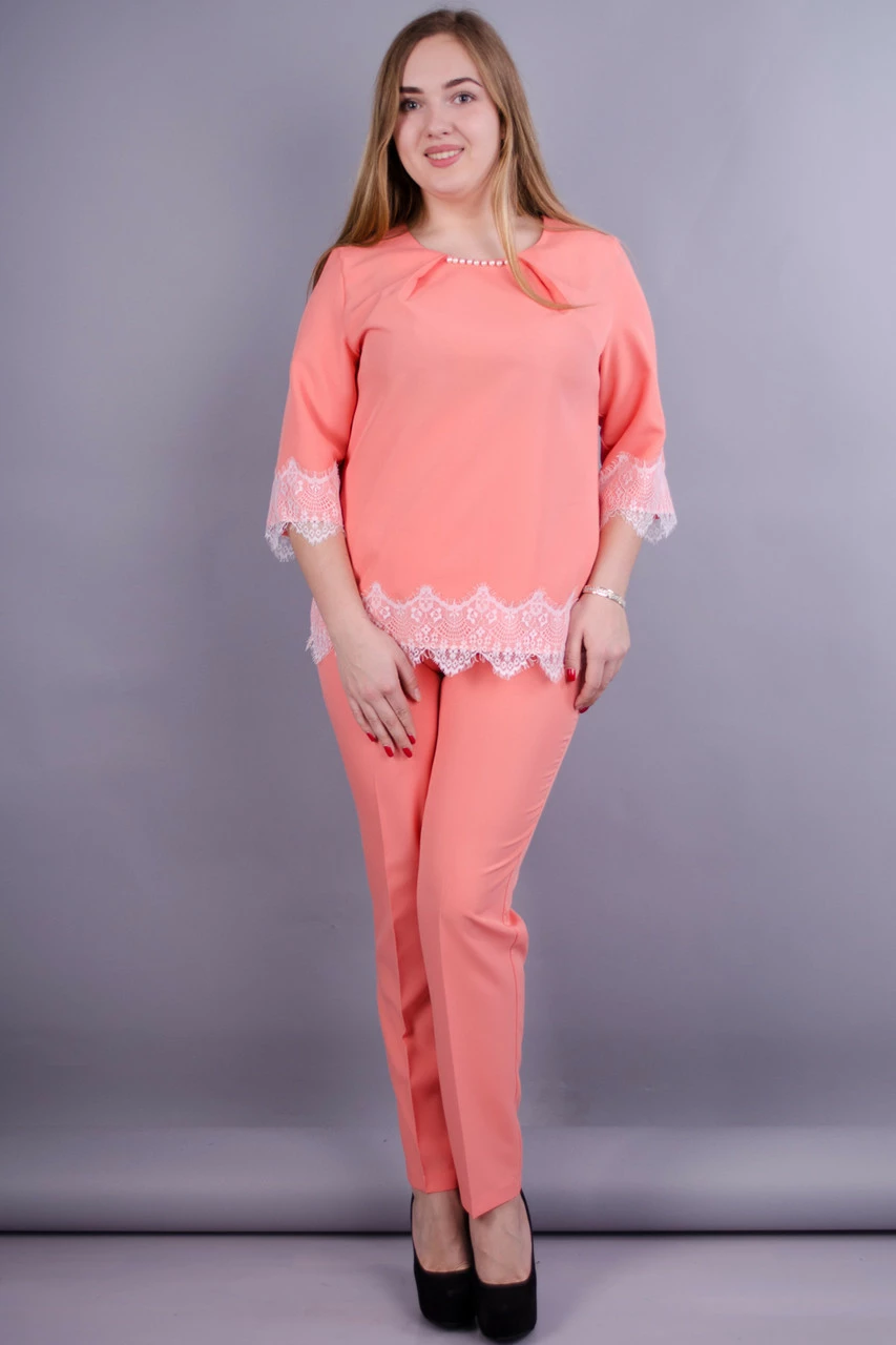 Брючні двійки зараз на піку популярності, а костюм Тей - ідеальне поєднання краси і зручності. Кофточка з рукавом 3/4, прикрашена набивними намистинами і мереживом. Штани на резинці і зі стрілками, що візуально подовжує ноги. Незамінна річ в гардеробі сучасної ділової жінки! Різноманітність кольорів і відтінків здивує і порадує навіть найвибагливіших пані. Відмінний варіант як для офісного стилю,так і в якості святкового костюма, для особливого випадку. Оригінальна і стильна альтернатива ошатній сукні.