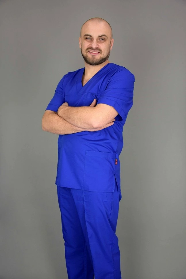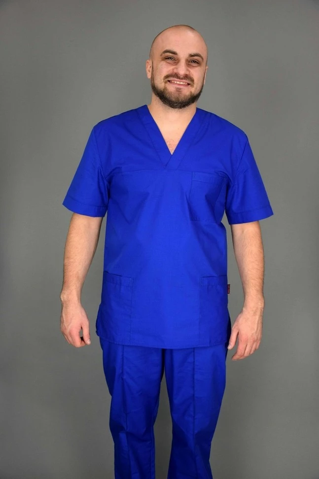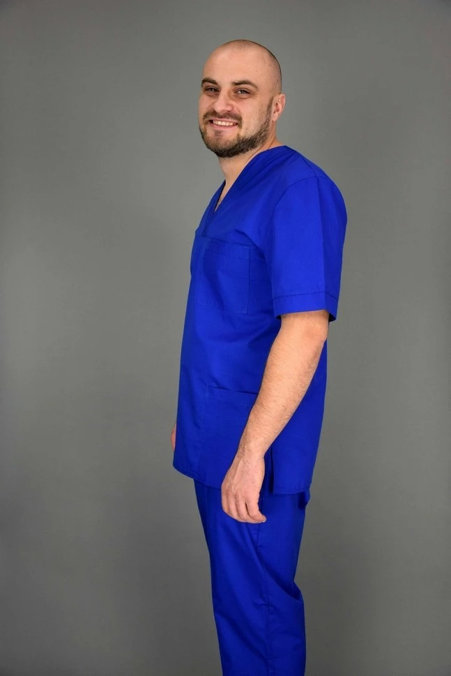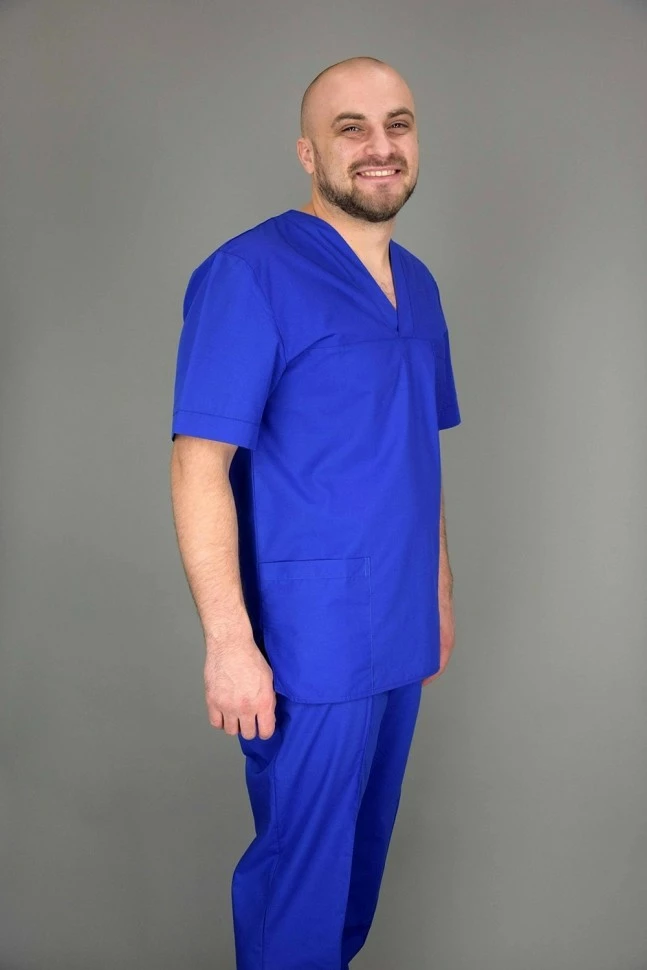 Комплектация: блузон – прямого силуэта с разрезами в боковых швах, перед с одним нагрудным и двумя боковыми накладными карманами, V- образный вырез горловины, обработан планками. Рукава медицинской спецодежды втачные, короткие; брюки – от бедра, прямой крой, на резинке.