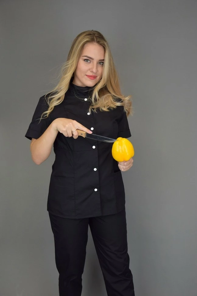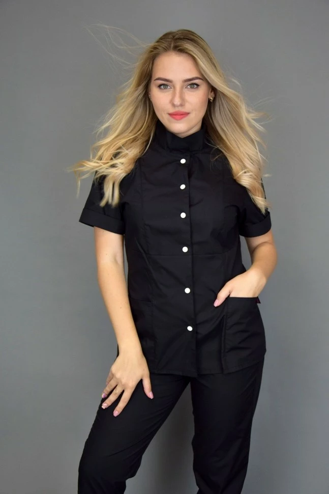 Стильный женский костюм подходит для разных сфер деятельности. На кофте короткий рукав с манжетом. Застежка на белых кнопках. Воротник стойка. Брюки стильного укороченного кроя, зауженные к низу.