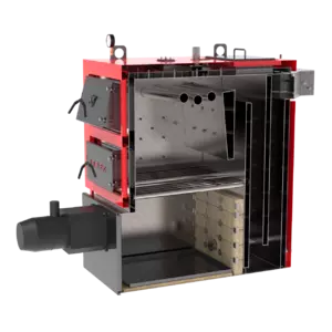 Демонтируется боковой люк котла, на место которого устанавливается ретортная горелка. Топливо подается из бункера с помощью шнека горелки, сгорания топлива проходит в нижней камере. Этот режим автоматической загрузки предназначен для сжигания пеллет и мелкого угля. Процесс горения контролирует блок управления. Питательный бункер для топлива защищен системой пожаротушения с термостатическим клапаном BVTS.