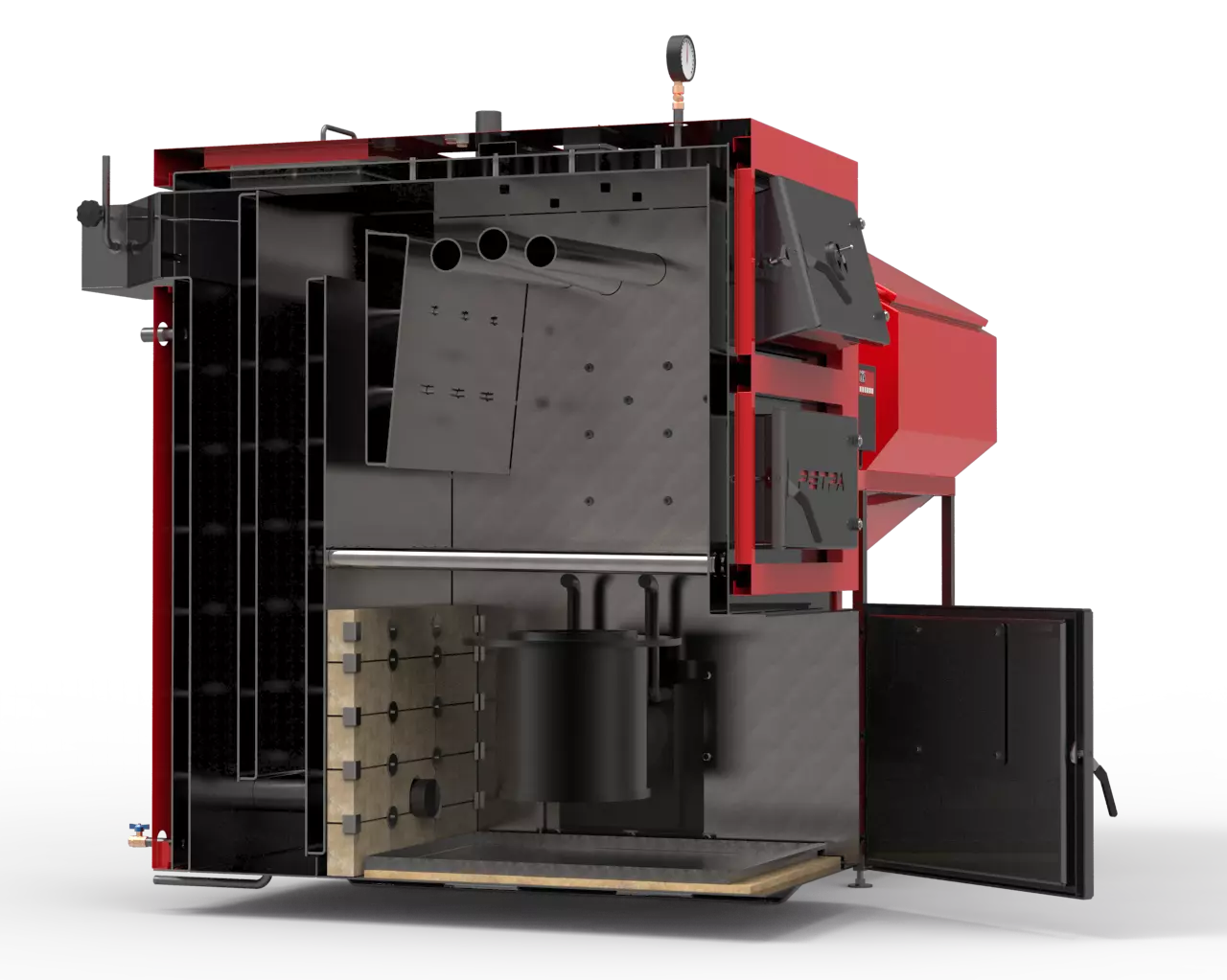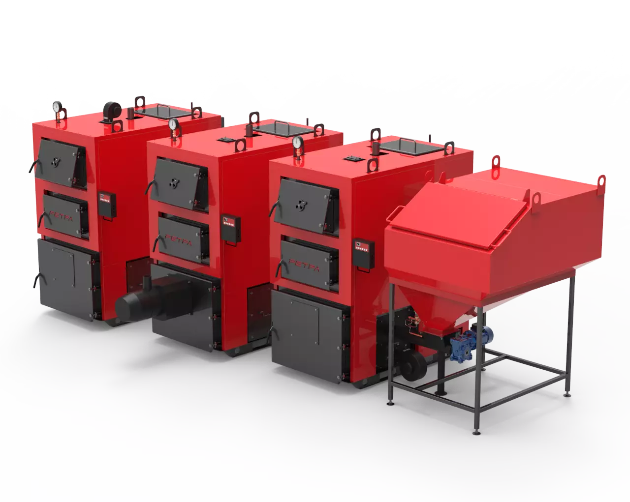 Демонтируется боковой люк котла, на место которого устанавливается ретортная горелка. Топливо подается из бункера с помощью шнека горелки, сгорания топлива проходит в нижней камере. Этот режим автоматической загрузки предназначен для сжигания пеллет и мелкого угля. Процесс горения контролирует блок управления. Питательный бункер для топлива защищен системой пожаротушения с термостатическим клапаном BVTS.