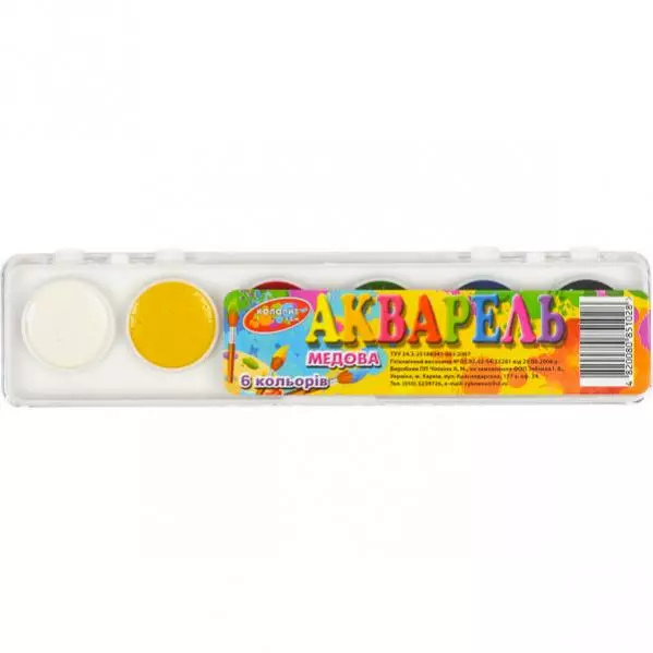 Пол: для всіх Вік: від 6-ти років Торгова марка: TM Колорит тонн Упаковка: поліетилен Матеріал: змішаний Школин акварельні фарби виготовляються з впровадженням натуральних компонентів, які містять мед і створені на основі органічних, найбільш стійких пігментів. Забезпечують прозорість, чистоту і яскравість кольору, фарби нетоксичний. У пластиковому коробі 6 яскравих кольорів.
