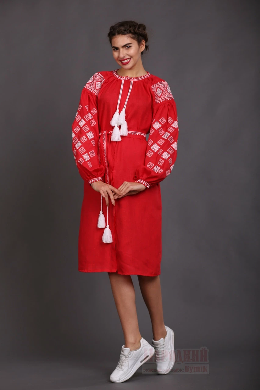 Красное вышитое средней длины с пышным рукавом пошито из 100 %