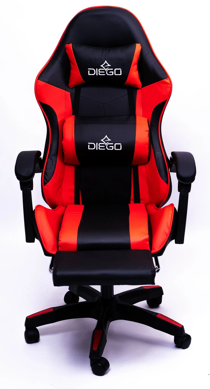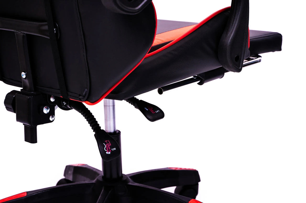 Кресло имеет возможность регулировать высоту сиденья, а также регулировать отклонение спинки. Независимо от роста пользователя, он подойдет любому человеку. Это будет работать как для старшего игрока, так и для ученика. Возможность отклонения в любом положении позволяет комфортно и удобно использовать во время игры – но не только-идеально подходит для многочасовой работы-кресло позаботится о правильном выравнивании позвоночника, после выбора правильного положения мы можем заблокировать его, нажав на рычаг вниз. Если вы хотите расслабиться, просто откиньте спинку и не запирайте рычаг, это позволит качаться, обеспечивая при этом адекватное кровообращение, а также снижает напряжение в мышцах. Используя отклонение, мы можем также использовать кресло для просмотра фильмов и т. д. Выдвижная откидная подставка для ног, выдвижная под сиденьем, обеспечивает комфорт и улучшает кровообращение в ногах. Специальный ковшовый профиль делает кресло очень комфортным, а усталость не так ощущается, как с обычными, простейшими моделями кресел. Дополнительным преимуществом являются 2 подушки-под голову и под позвоночник, которые эффективно снимают шейный и поясничный отдел. Подушки на ремнях, застегнутых” на клик", гарантируют стабильность. Они не скользят, а также позволяют устанавливать их на удобную для себя высоту. Чехол для сиденья можно снимать и стирать при низкой температуре, поэтому держать его в идеальном состоянии не является проблемой. Нижняя часть игрового кресла представляет собой прочную крестообразную 5-спицевую основу с нескользящими подушечками для ног и силиконовыми колесами, не царапающими поверхность.