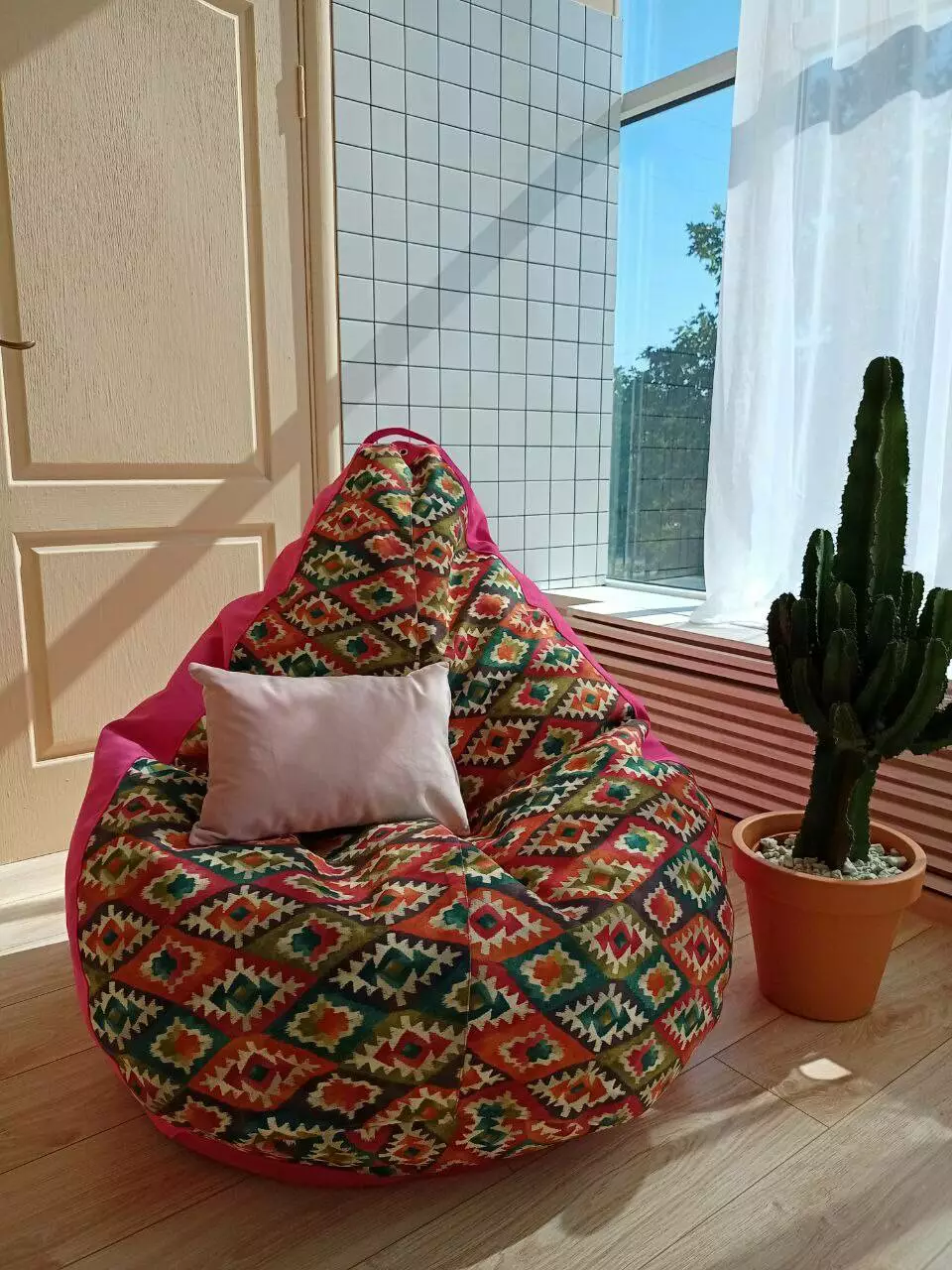 Пуф має ручку для зручного переносу та обов’язково люверси (отвори
