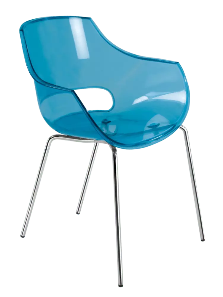 Напівкругле дизайнерське крісло Opal ергономічної форми, укомплектовано зручними сидінням і спинкою. Безшовне крісло виготовлено з прозорого полікарбонату - міцного матеріалу, стійкого до впливу вологи, до подряпин, механічних пошкоджень. Ніжки хромовані, глянцеві, оснащені поліуретановими заглушками. Крісло гармонійно впишеться в інтер'єр вітальні, спальні, кухні, обідньої зони. Може бути використано для облаштування приміщення кафе, ресторану, робочого кабініу, офісу. Крісло рекомендується використовувати виключно в приміщенні.