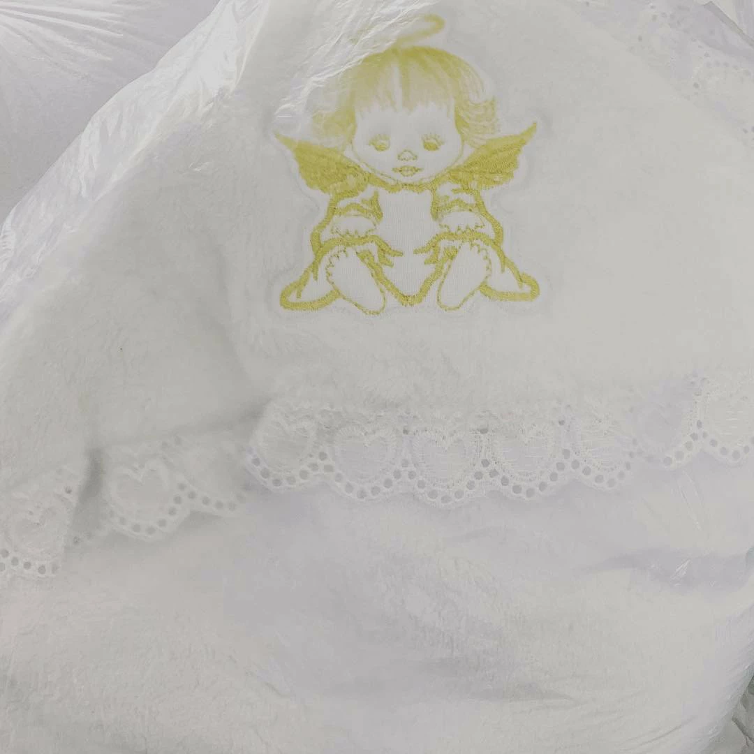Эта модель украшена кружевом и вышивкой ангелочка на уголке.