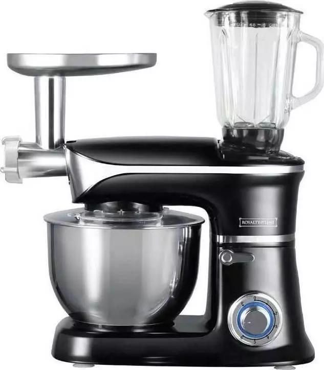 Кухонный комбайн непременно упростит работу на кухне, ведь он не только многофункциональный, но и достаточно быстро справляется с любой поставленной задачей. Мы предлагаем вашему вниманию кухонный комбайн от торговой марки Royalty Line, который успешно соединил в себе тестомес, мясорубку и блендер. Комбайн выполнен из прочных материалов, верх ― плотный пластик, чаша для замеса теста выполнены из нержавеющей стали, мясорубка и все аксессуары из прочного сплава металла, чаша блендера выполнена из толстого стекла. В комплекте ― стандартный набор насадок для мясорубки, крюк для замеса, насадка для взбивания и для непосредственного замеса теста. Мощность комбайна ― 1900 Вт. 6 режимов работы, плюс режим пульсации и плавная регулировка. Кухонный комбайн работаем сравнительно тихо. В комплекте есть прозрачная защита от брызг, объем чаши блендера 1,5 л, есть мерочная шкала, объем чаши для замеса ― 6,5 л. Мясорубку и блендер легко устанавливать. Комбайн быстро разбирается. У основания есть присоски, которые не допускают скольжения комбайна по любой поверхности.