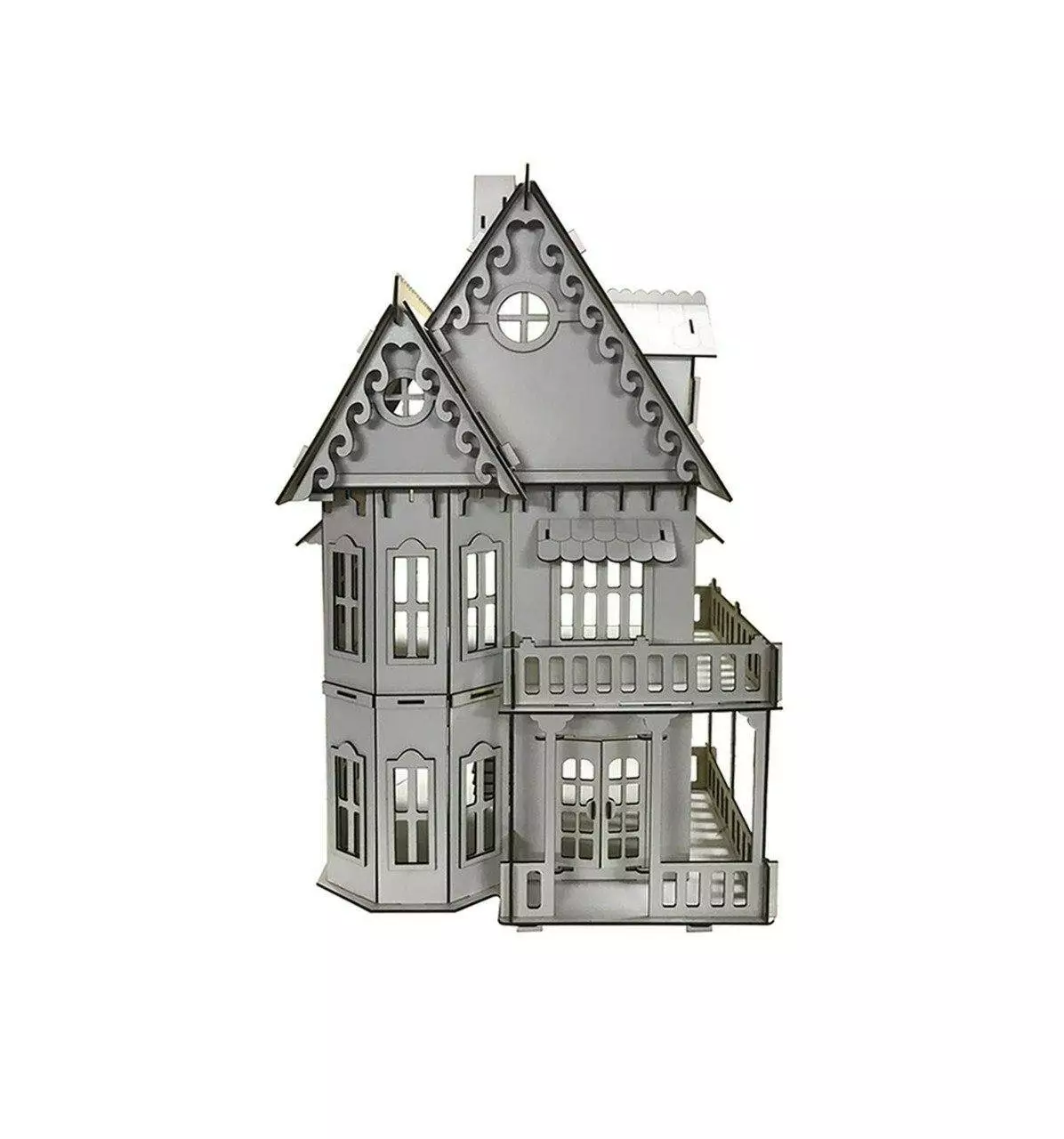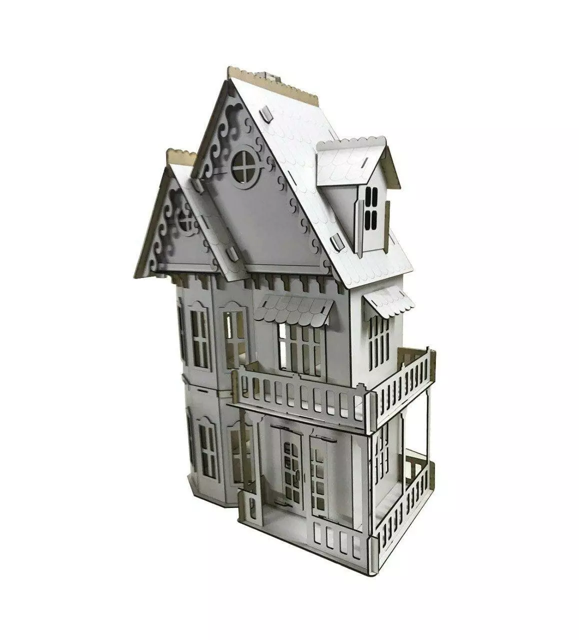 Кукольный домик из ХДФ имеет три этажа, две террасы и чердак. В