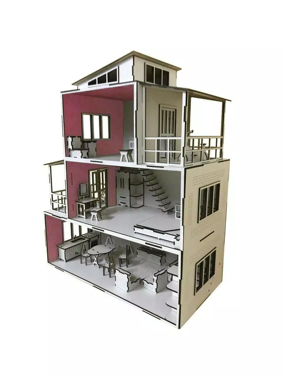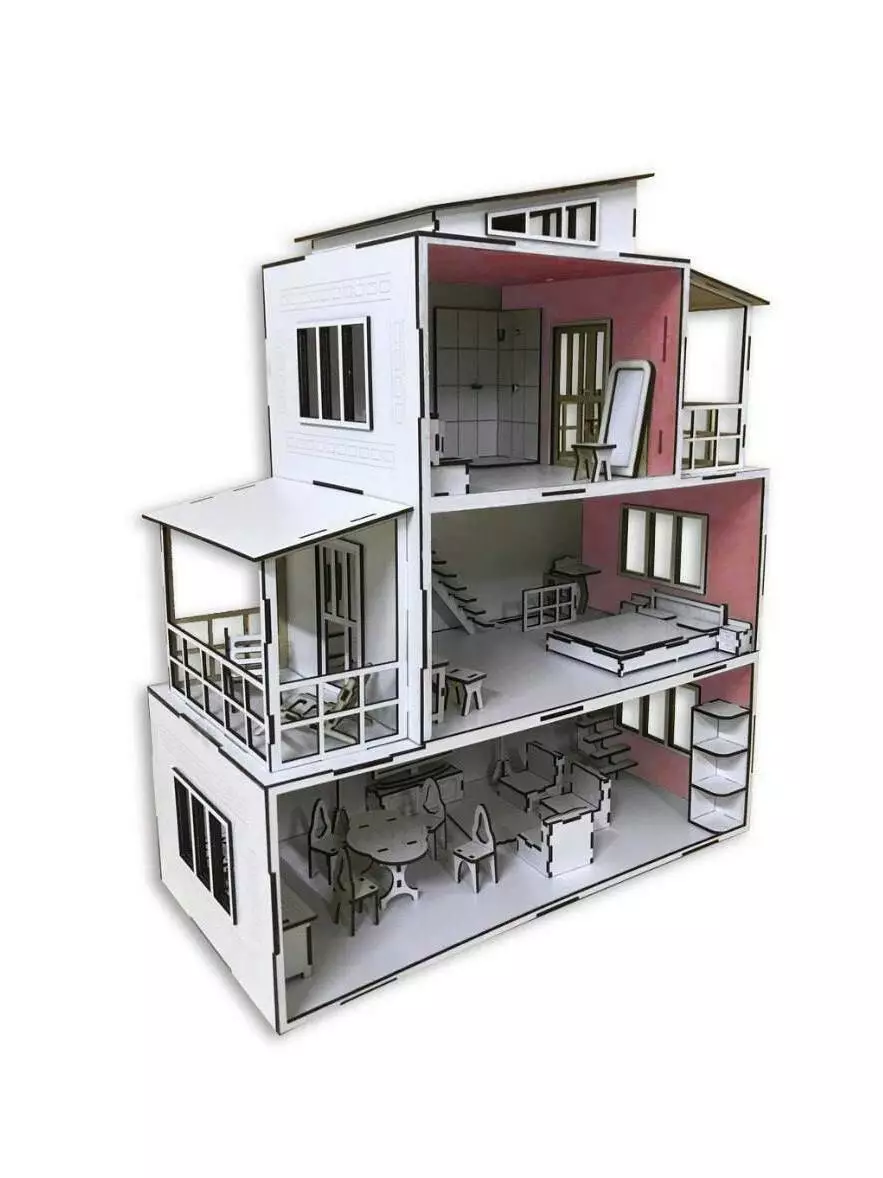 Кукольный домик из фанеры имеет три этажа, две террасы и чердак. В комплект поставки входит кукольная мебель, которую можно передвигать и украсить по своему вкусу.