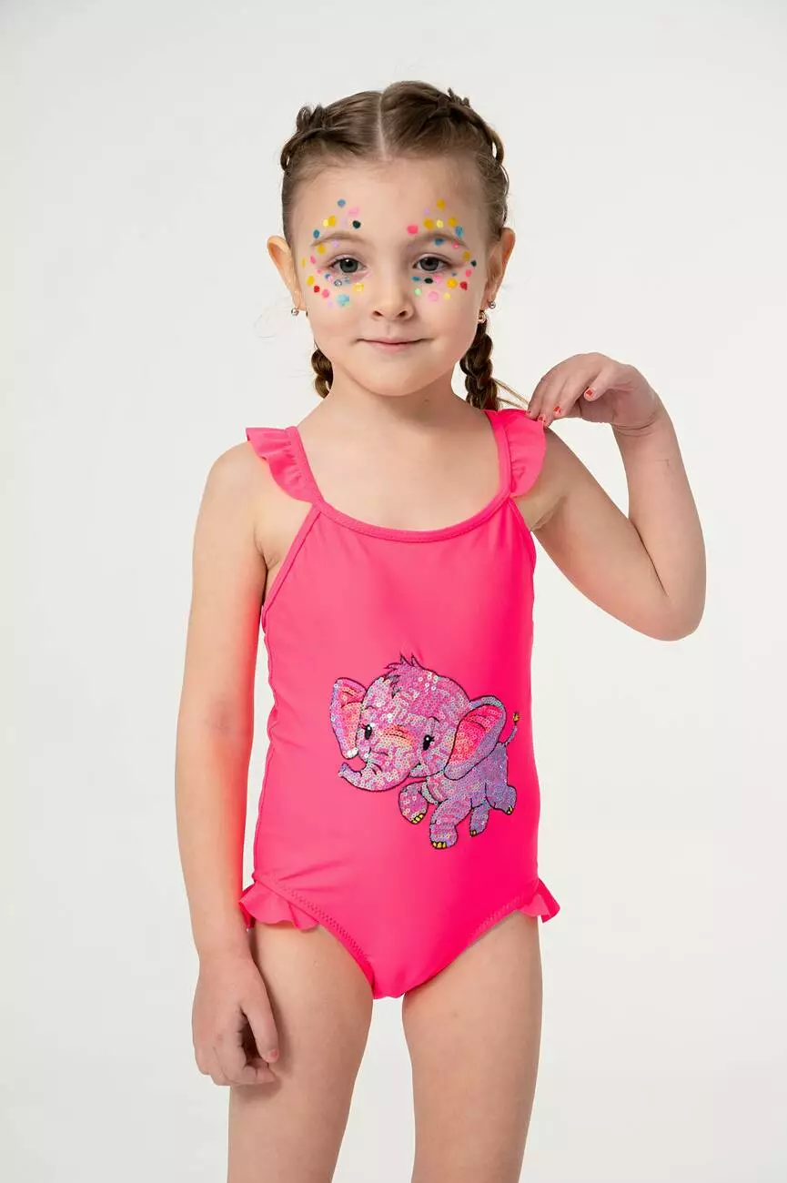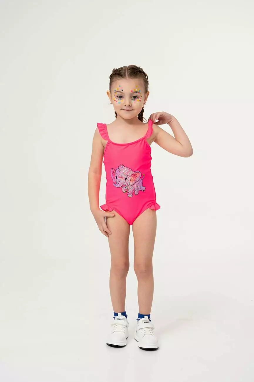 Деталі моделі: рожевий купальник. Цільна конструкція. На грудях велика аплікація у вигляді слона із дрібних паєток. Лямки купальника не регулюються за довжиною.