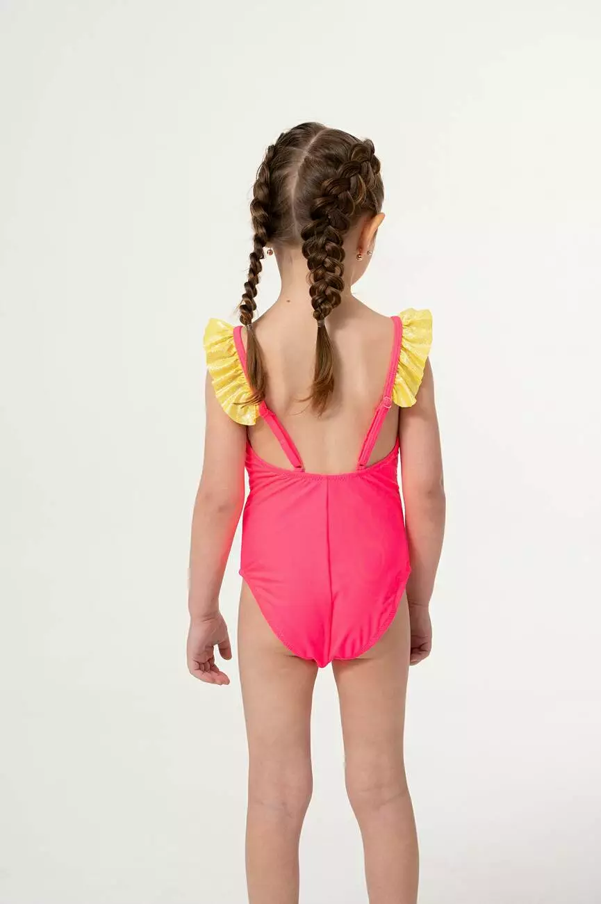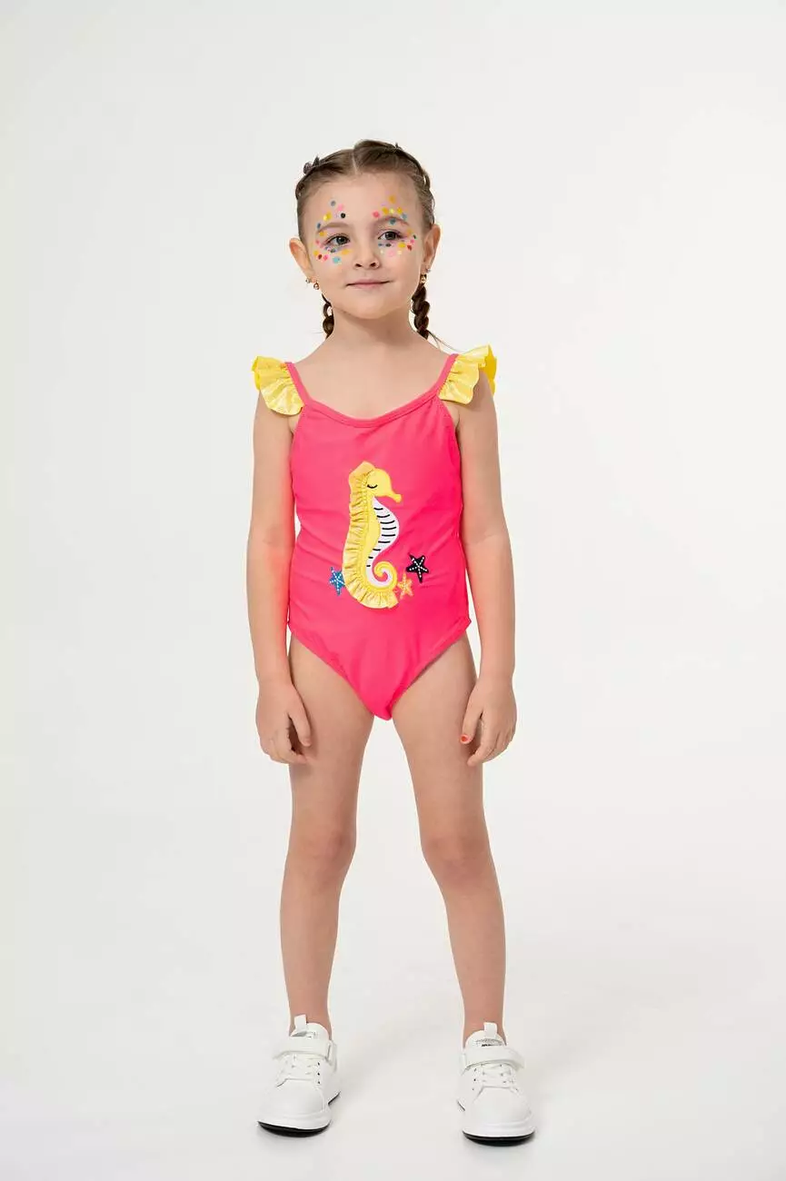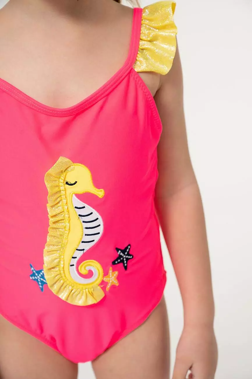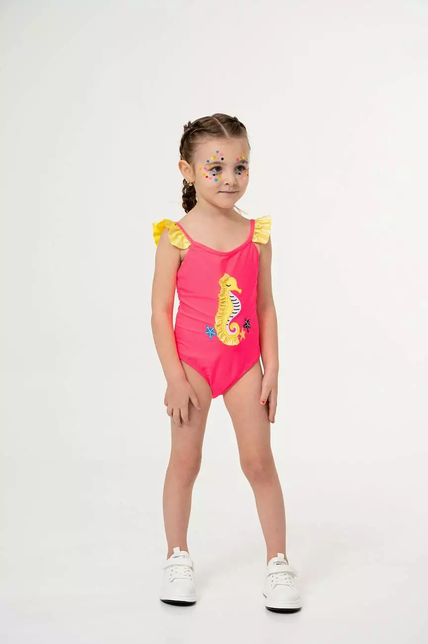 морського коника. Лямки купальника доповнені жовтими воланами,