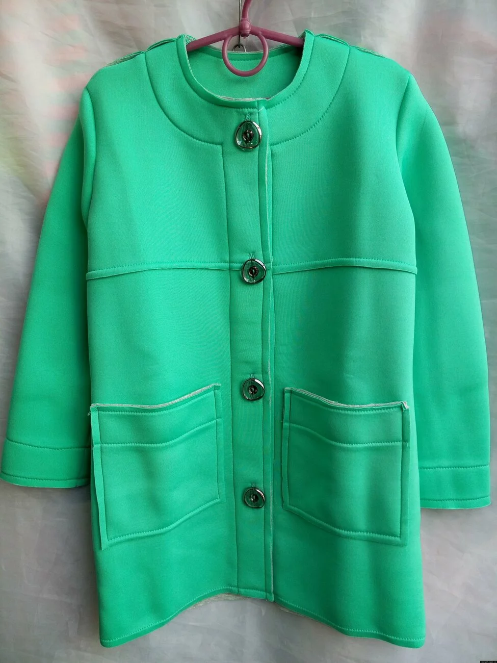Подростковое пальто из неопрена,мятного цвета. Отличное качество,внутри на х/б основе.Прекрасно будет смотреться на детях возрастом от 7 до 11 лет.