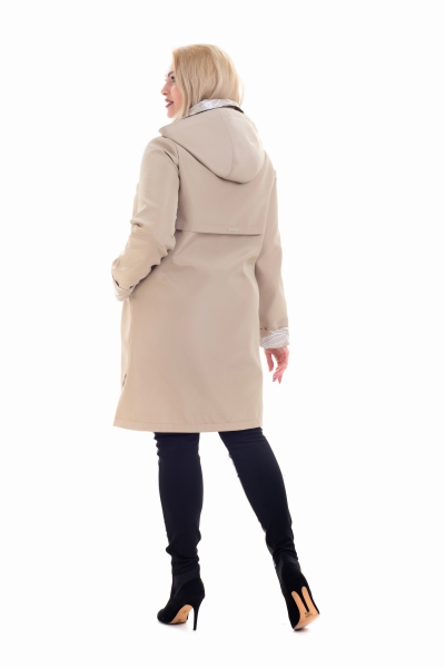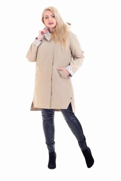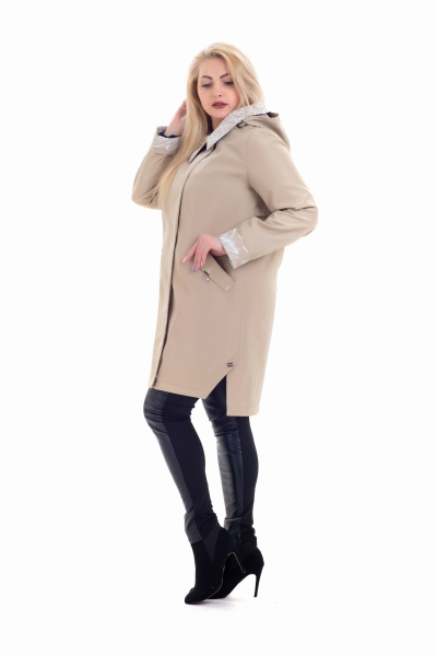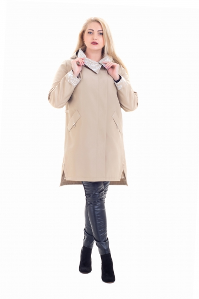 Ветровка женская бежевая Основная ткань - плащевка на интерлоке "JORDAN" Подкладка - атлас/сатин Застежка - молния, кнопки Карманы - 2 шт. Капюшон - отстежной (на кнопках) На воротнике и манжетах принт Украшения под хром