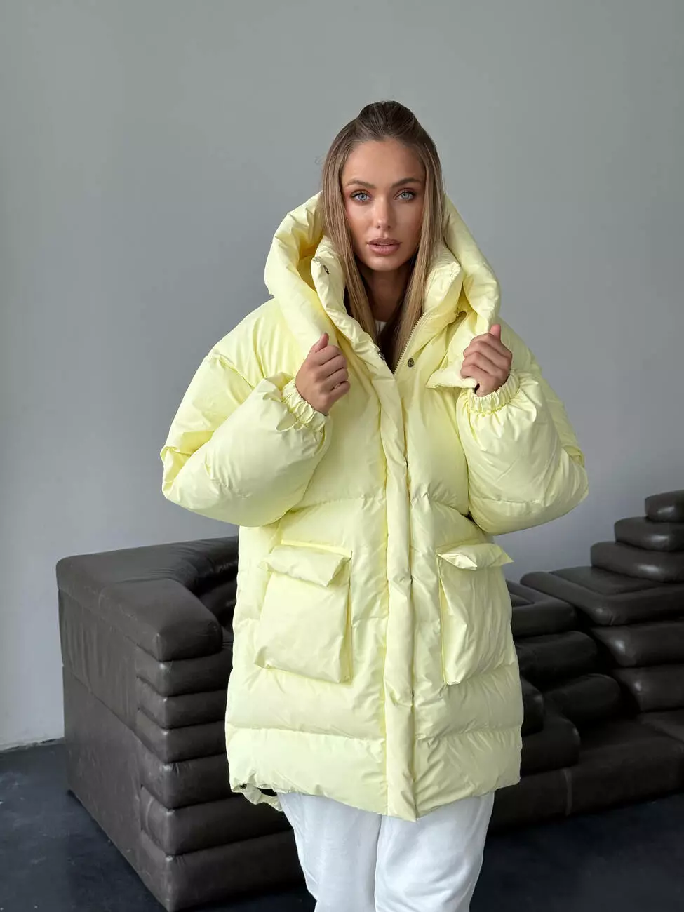 Зимовий подовжений пуховик, виконаний з плащівки на мембрані, що є непродувною і водонепроникаючою. Капюшон знімається