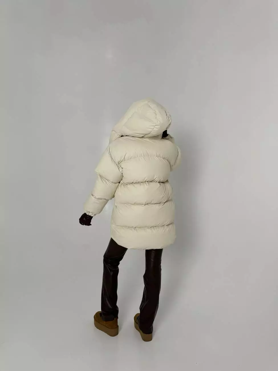 Зимовий подовжений пуховик, виконаний з плащівки на мембрані, що є непродувною і водонепроникаючою. Капюшон знімається