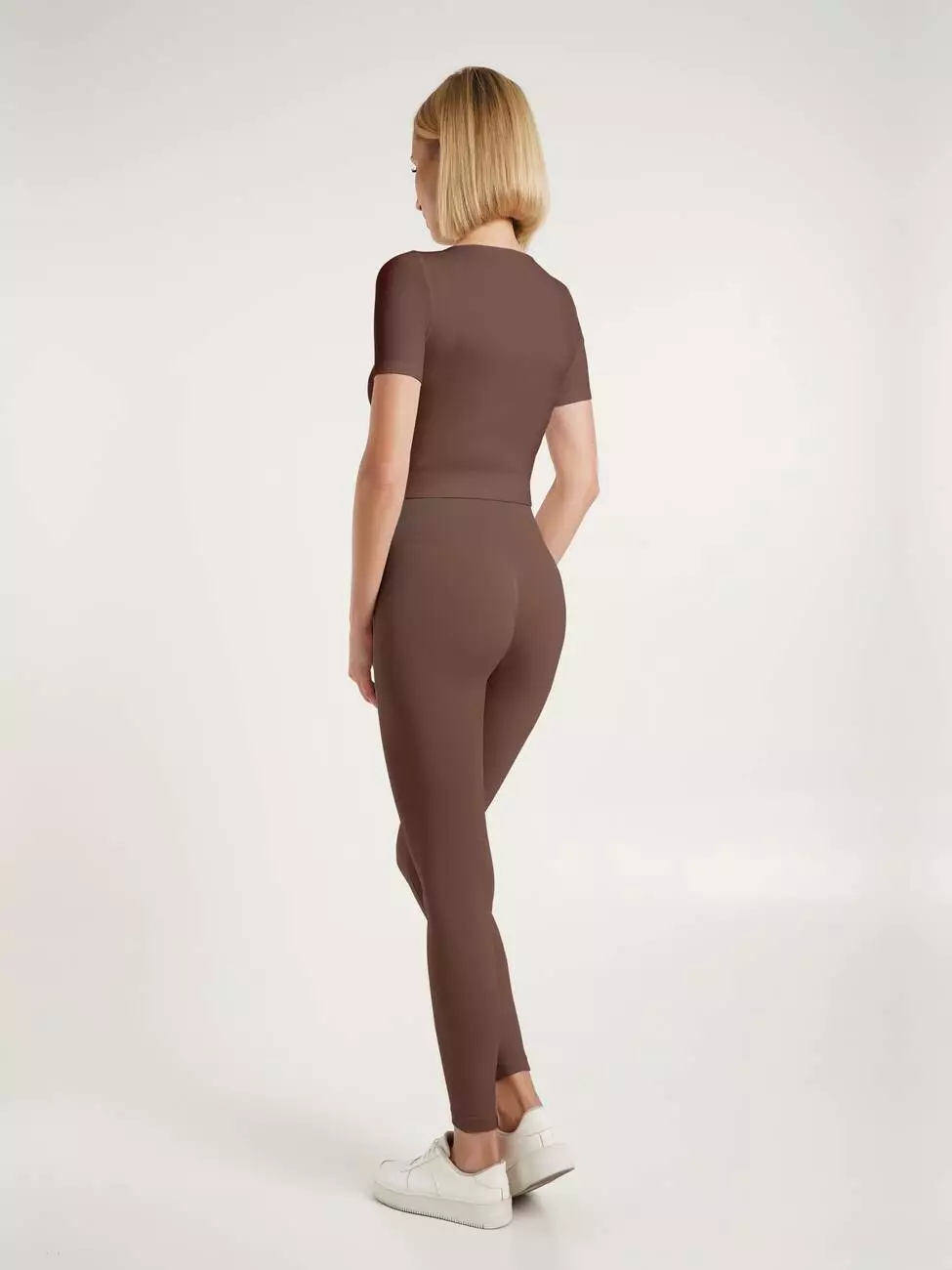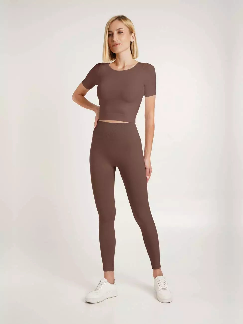 Жіночі безшовні легінси з м’якої мікрофібри забезпечують щільне облягання та підкреслюють вигини фігури. Збірчастий шов ззаду створює ефект підтягнутих сідниць, додаючи силуету виразності. Висока посадка та широкий пояс забезпечують підтримку живота й комфортну фіксацію на талії. Ідеальні для тренувань і активного способу життя.