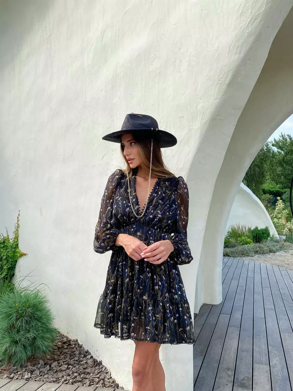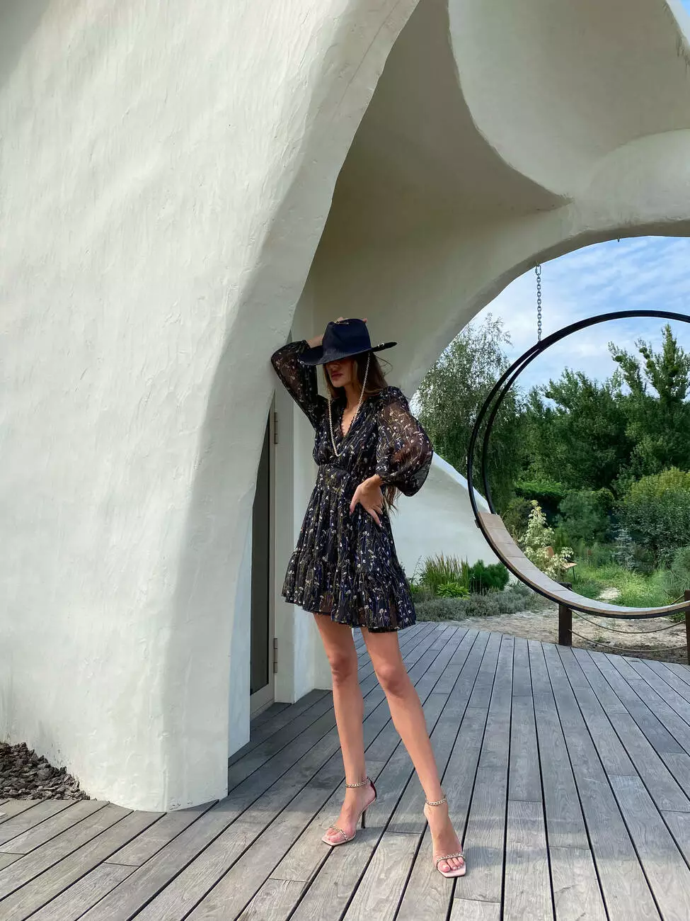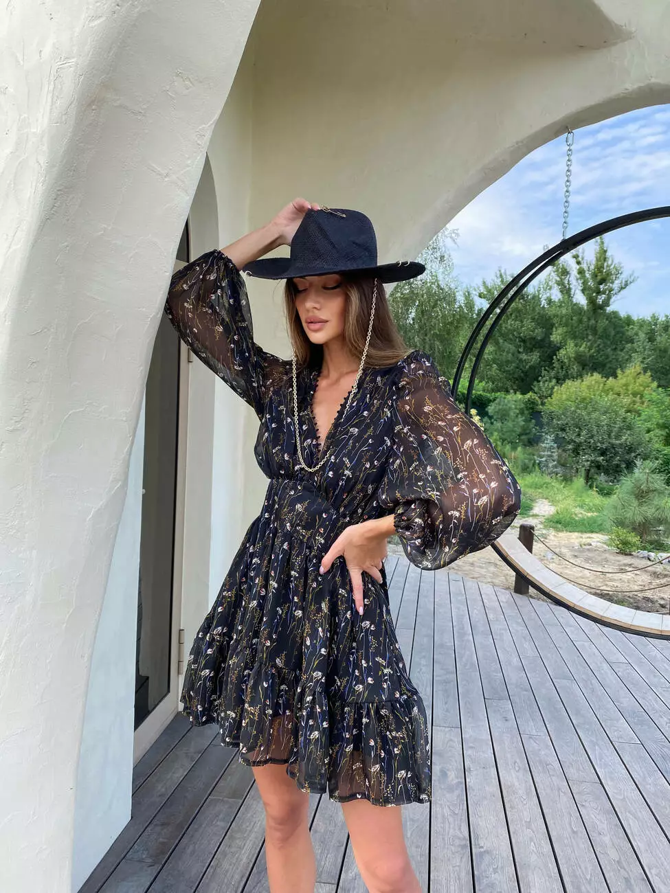 Легка та романтична сукня у квітковий принт має V-подібний виріз та довжину рукава 3/4.