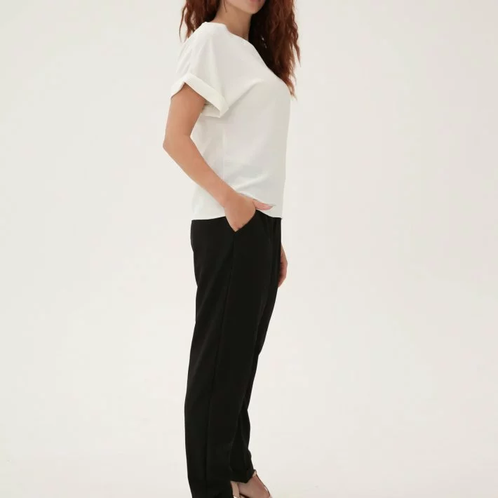 застібки. Штани з кишенями з обох боків. У поясі в брюках еластична