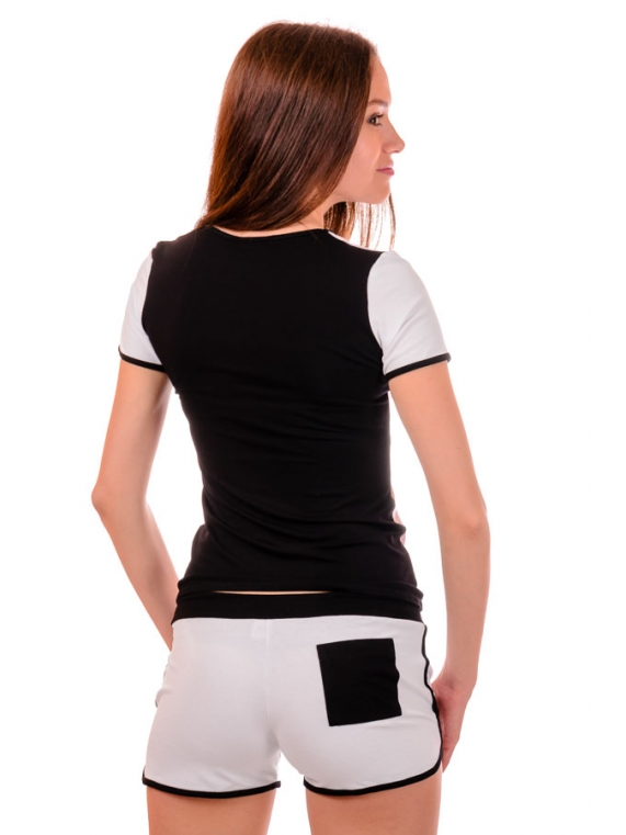 Отличный спортивный комплект шорты с футболкой. Подойдет как для занятий спортом, так и для повседневной прогулки, либо поездки на отдых. Очень интересно смотрится за счет сочетания контрастных цветов. На груди и сзади на шортах - пришивные карманы. Шорты затягиваются на шнурок. Ткань - вискоза. Длина футболки 56см, длина шорт 27см.