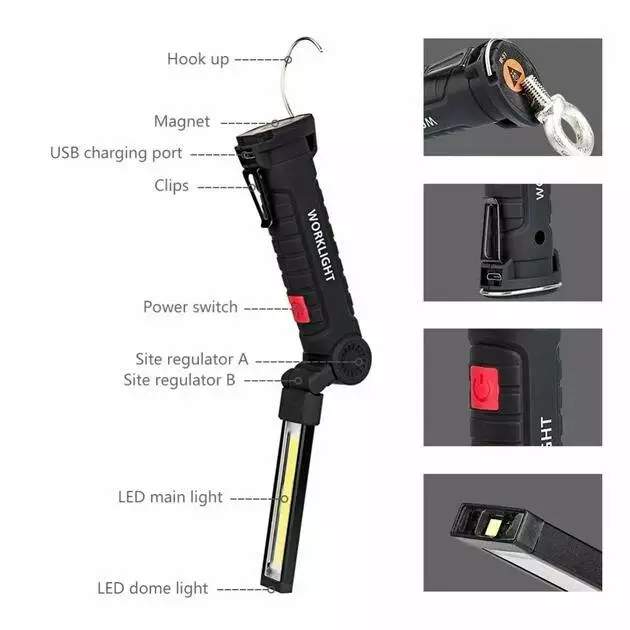 Багатофункціональний cвeтoдіoдний фонap з мигнітом і гачком має 5 режимів підсвітки:
