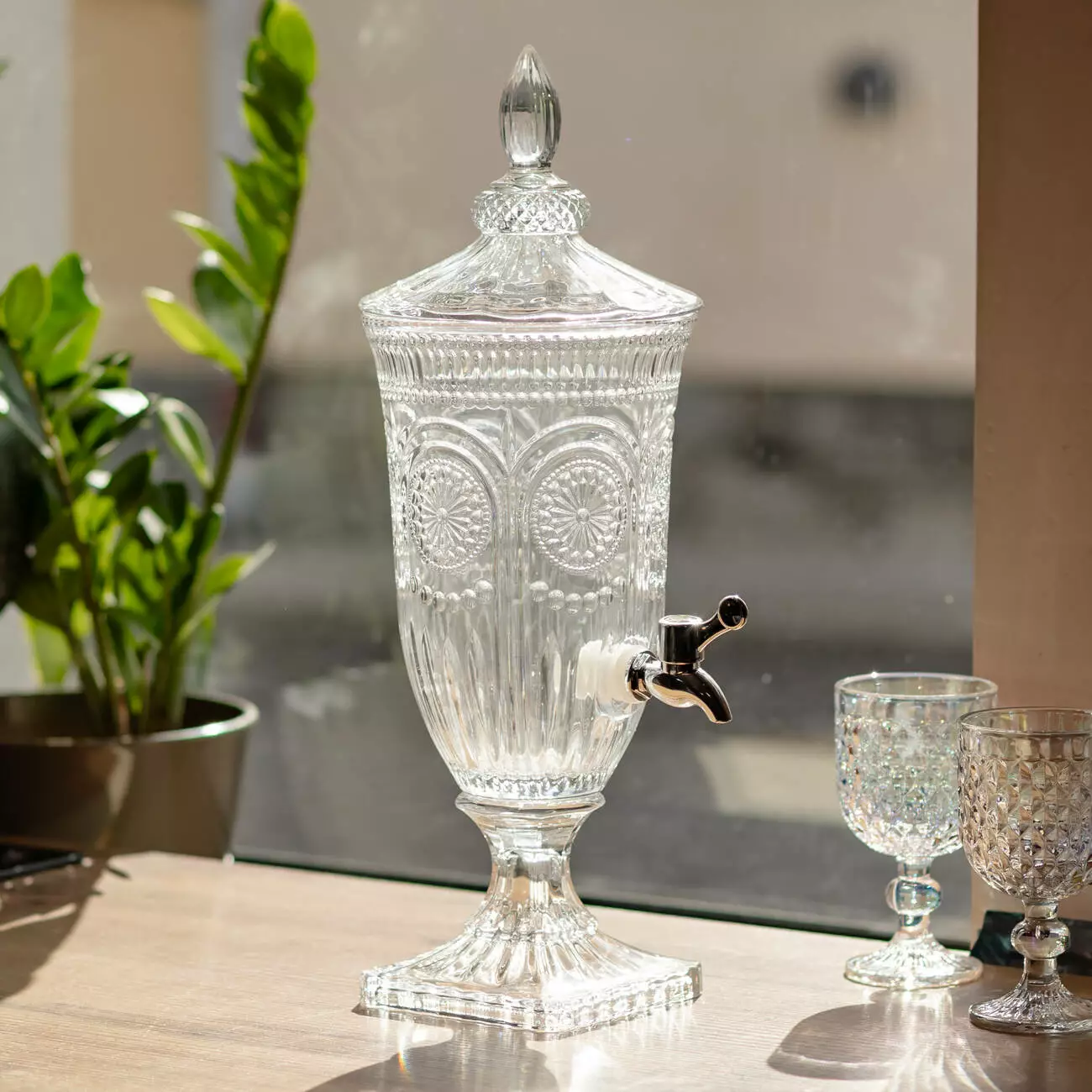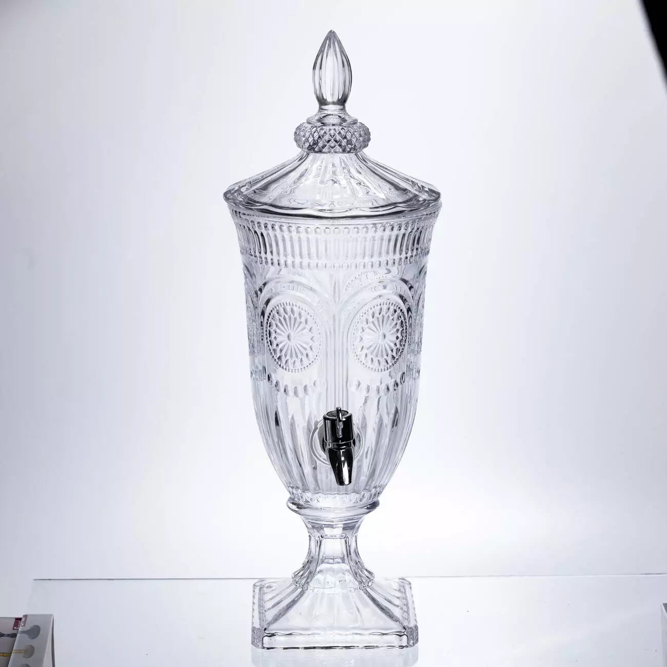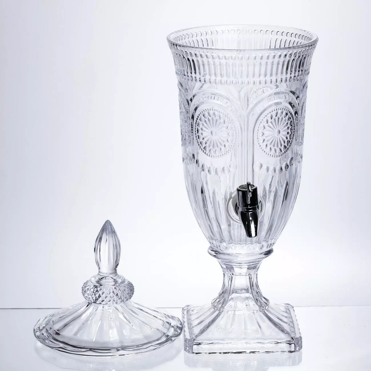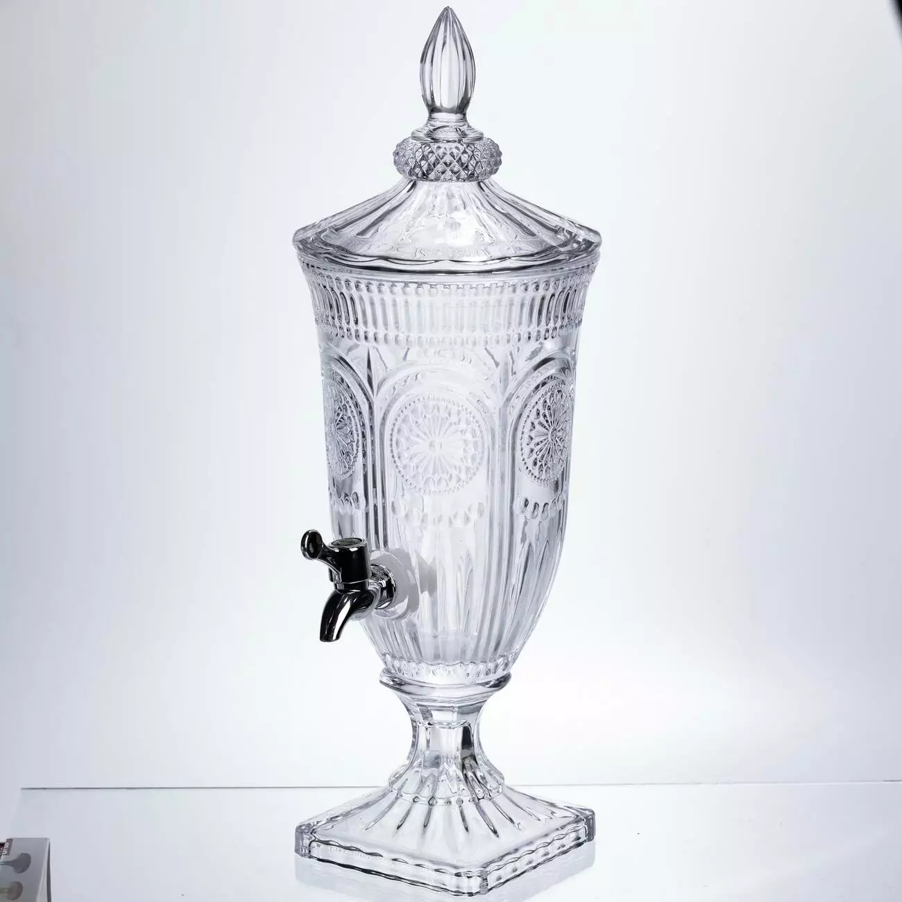 Компактний диспенсер із прозорого скла зі складним рельєфним орнаментом. Тонка проробка візерунків та класична форма роблять його чудовим вибором для сервірування святкового столу, фуршетів чи затишних чаювання на веранді.