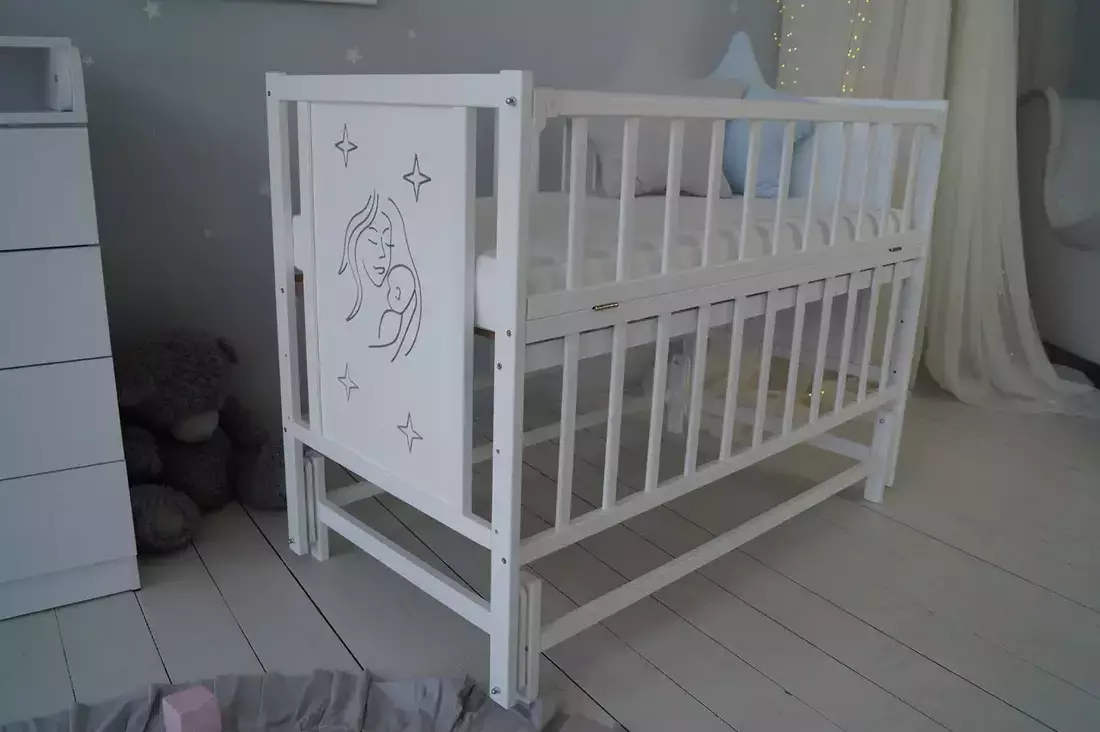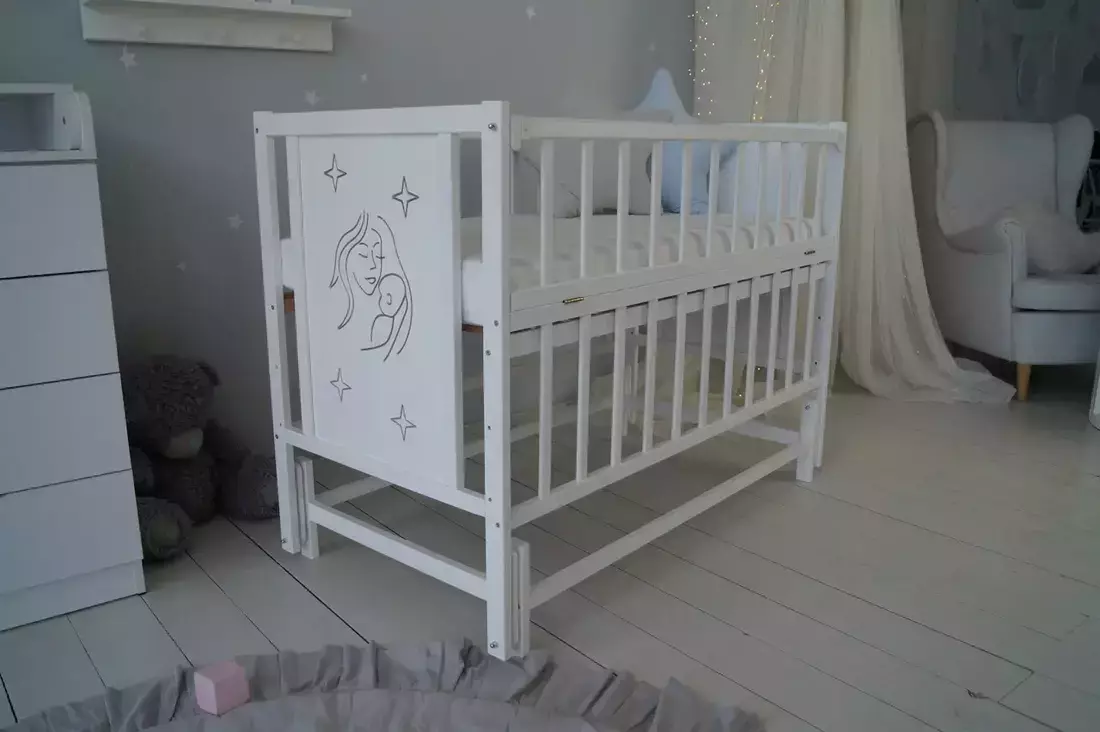 Найсолодші і найбільш приємні сни ваш малюк побачить у нашому чудовому ліжечку Baby Comfort Матуся. Гарне, стильне, практичне і зручне. Ліжко виконане з натурального матеріалу - масиву дерева бук, зверху покрите фарбою на водній основі. Представлене у приємному білому кольорі - відмінно підійде як для дівчинки, так і для хлопчика. Прикрашено різьбленням та патиною матусі та малюка - дуже естетично та символічно. Ліжечко має всі характеристики, які потрібні для повноцінного сну вашого малюка. Є відкидний бортик, 3 положення днища, а також маятникова система заколисування. З цим ліжечком малюк буде спати в повному комфорті і безпеці, а новоспечена мама буде насолоджуватися материнством на всі сто відсотків.