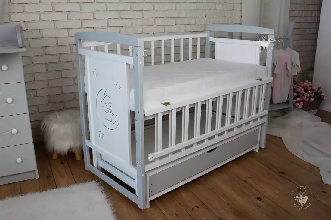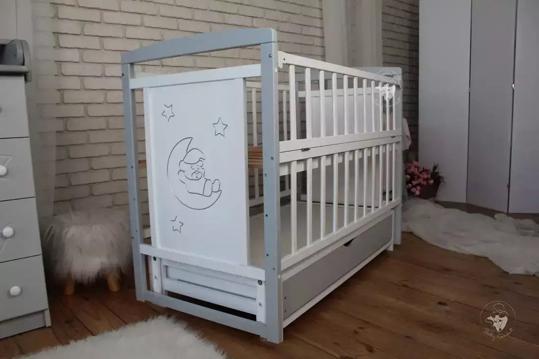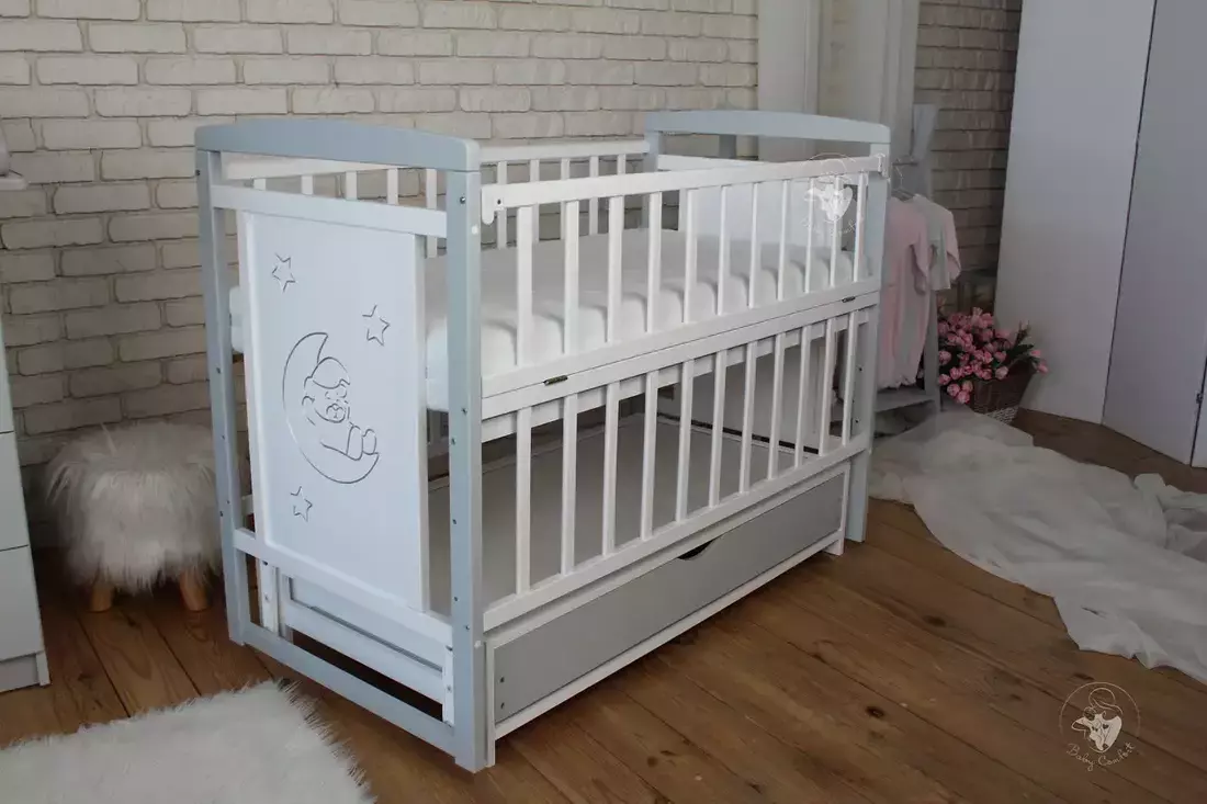 Дитяче ліжечко Baby Comfort TEDDY - уособлення стилю та функціональності. Ліжечко виконане із масиву натурального дерева бук згідно всім вимогам виготовлення меблів для дітей. Вона ідеально відшліфована, пофарбована фарбою на водній основі європейського виробництва - безпечною для малюка та батьків. Бокові стінки прикрашені різьбленням та срібною патиною, що надає ліжечку ексклюзивності. Окрім привабливого зовнішнього вигляду ліжечко володіє широким функціоналом, який значно спрощує батькам догляд за новонародженою дитиною. Це і відкидкий бортик, дякувати якому малюка буде легко дістати з ліжечка, а також - використовувати його як приставне. Безшумний маятник допоможе заколихати дитину, а наявність фіксатора - приємний бонус для діток старше, коли необхідність в заколихуванні відпаде. Днище ліжечка регулюється по висоті, тому в залежності від віку його можна ставити у різне положення. А закрита шухляда на телескопічних напрямних слугуватиме чудовим місцем для зберігання речей першої необхідності.