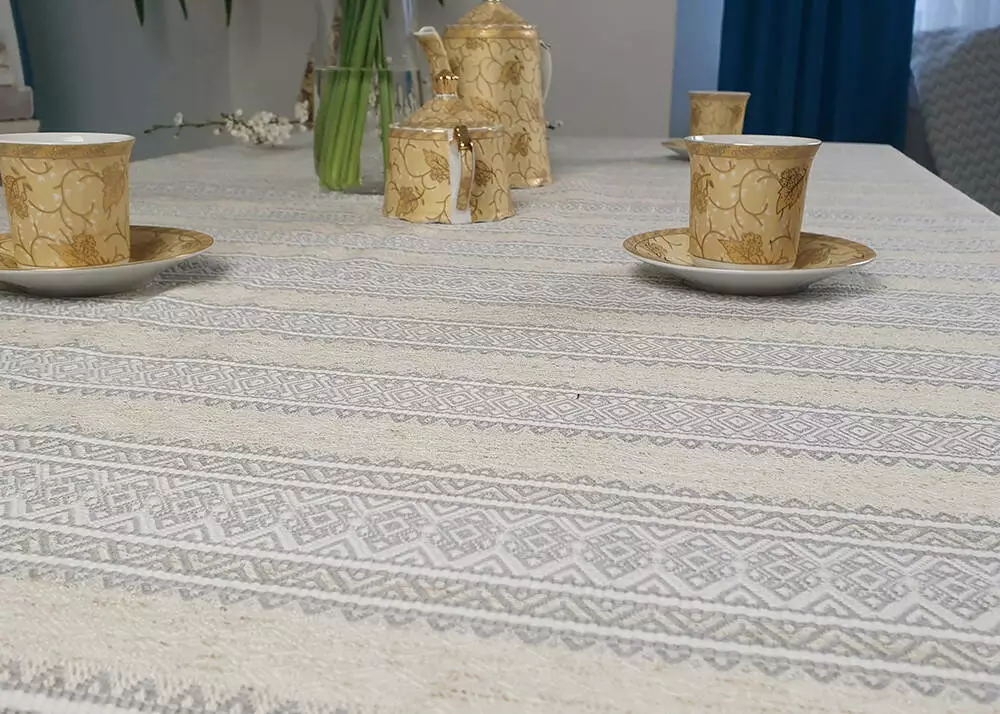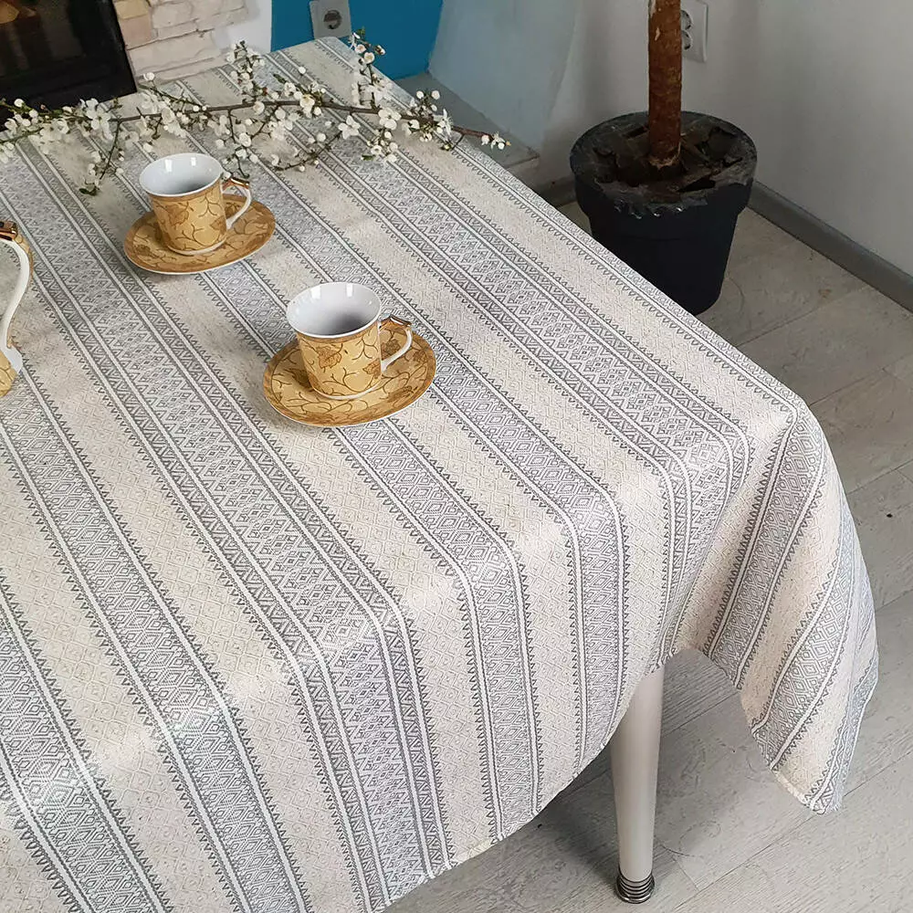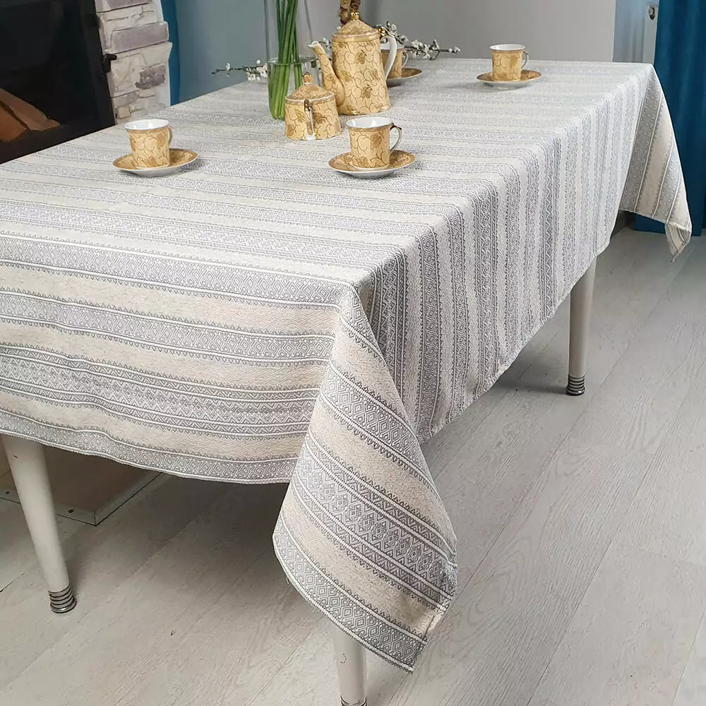 Народным орнаментам место не только в музеях или ресторанах в этническом стиле. Такая скатерть обязательно приглянется вашим гостям! Нежно-серые узоры как приподнятые над контрастным фоном. На фоне такого полотна ваша посуда будет выглядеть по-особенному празднично. Наслаждайтесь с радостью!