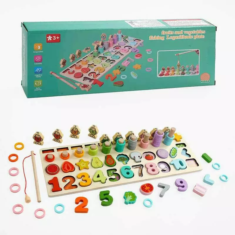 Логічна дерев’яна дошка C 67016 (40) магнітна риболовля, кілочки з кільцями, сортер, цифри, продукти, в коробці