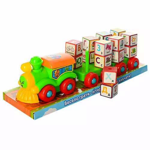 Локомотив 2366UA з причепом, мотузка, літери-кубики (укр.), бліст., 38-12-11 см.