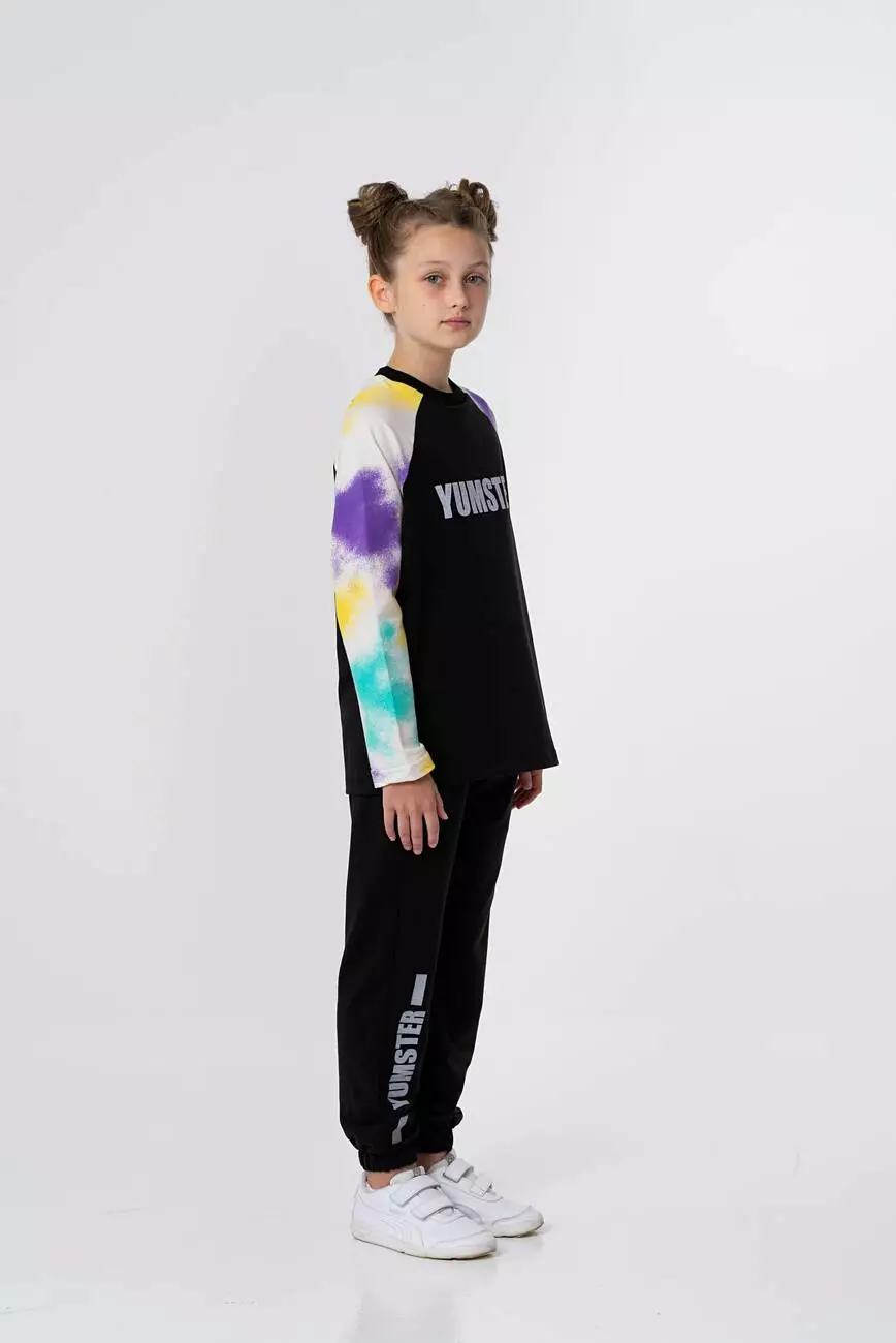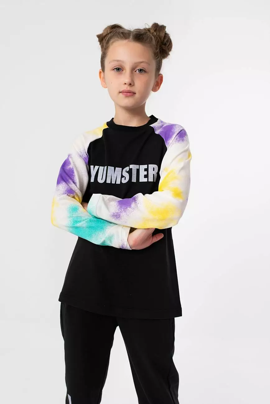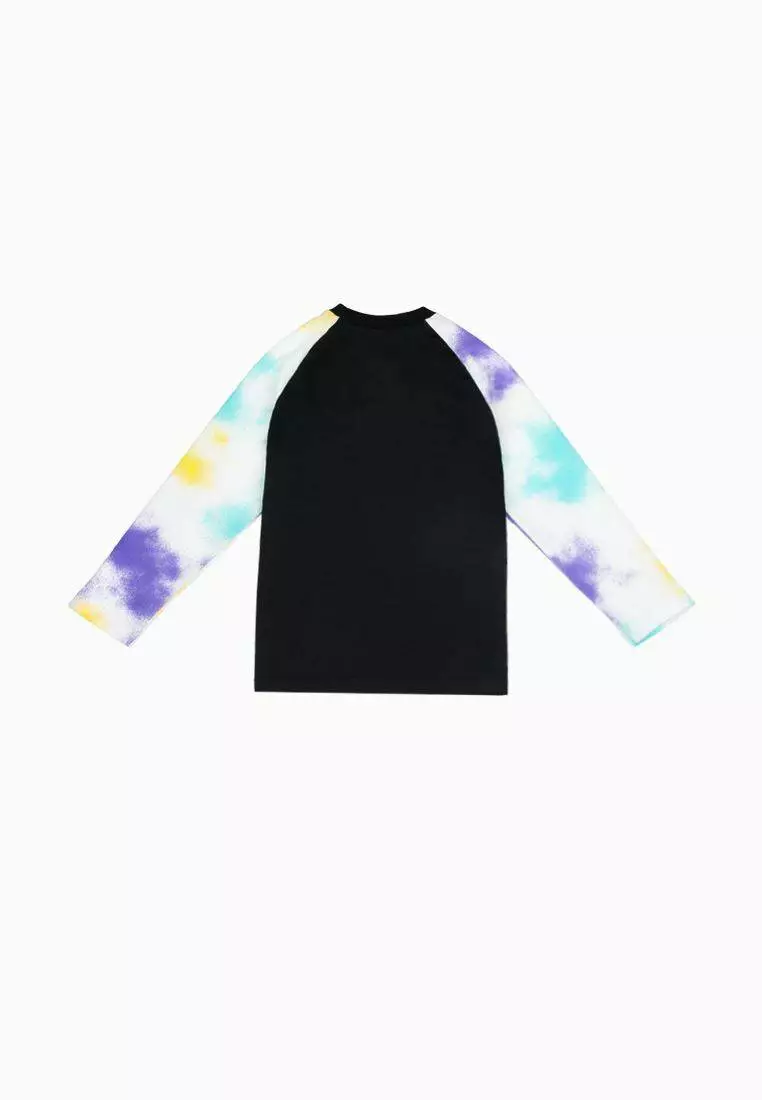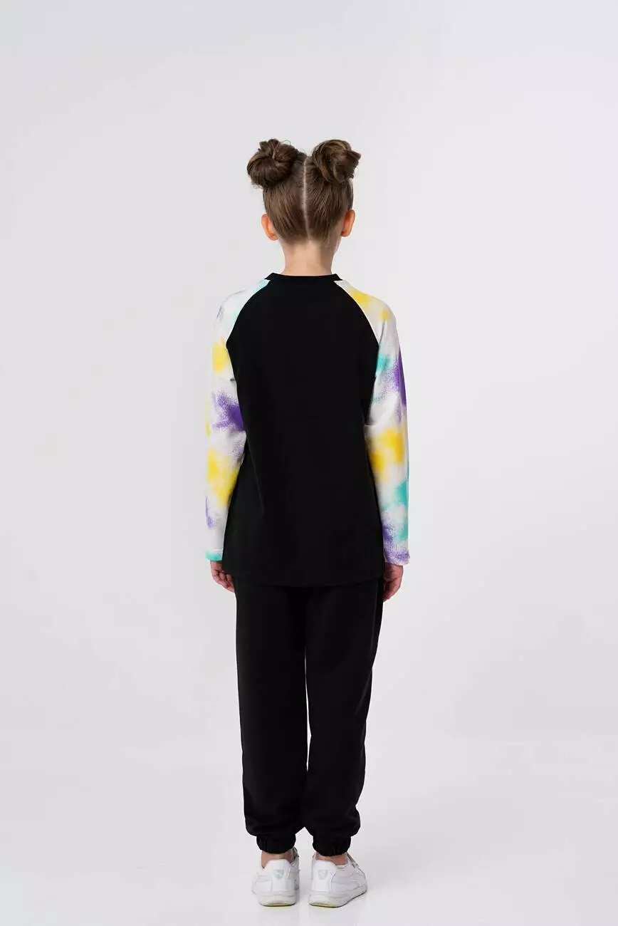 чорний. Рукава з принтом тай-дай. Фасон рукава - реглан. Спереду