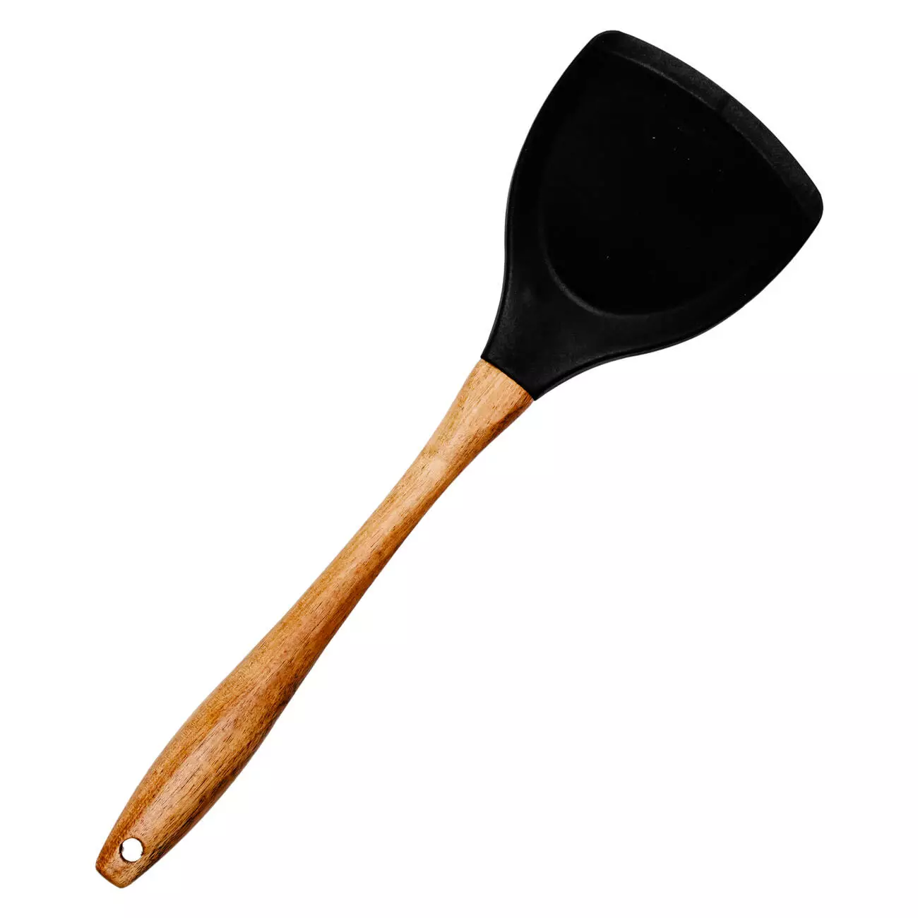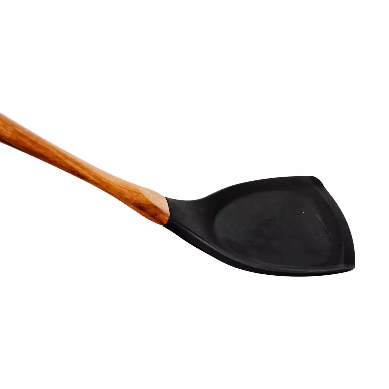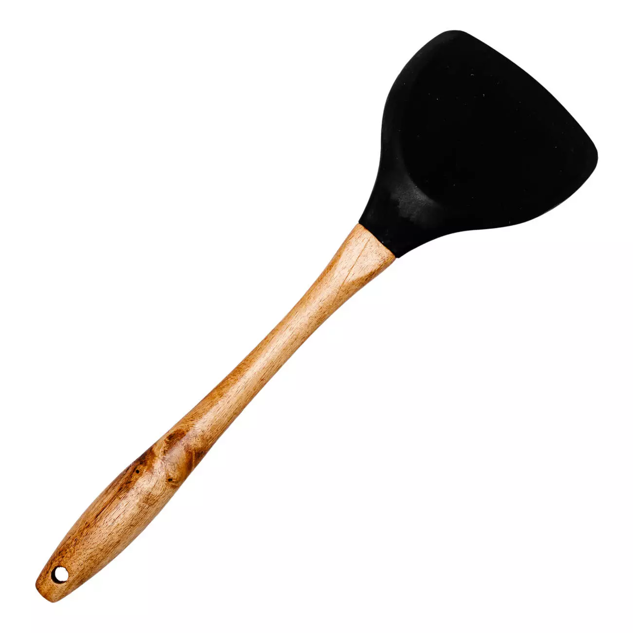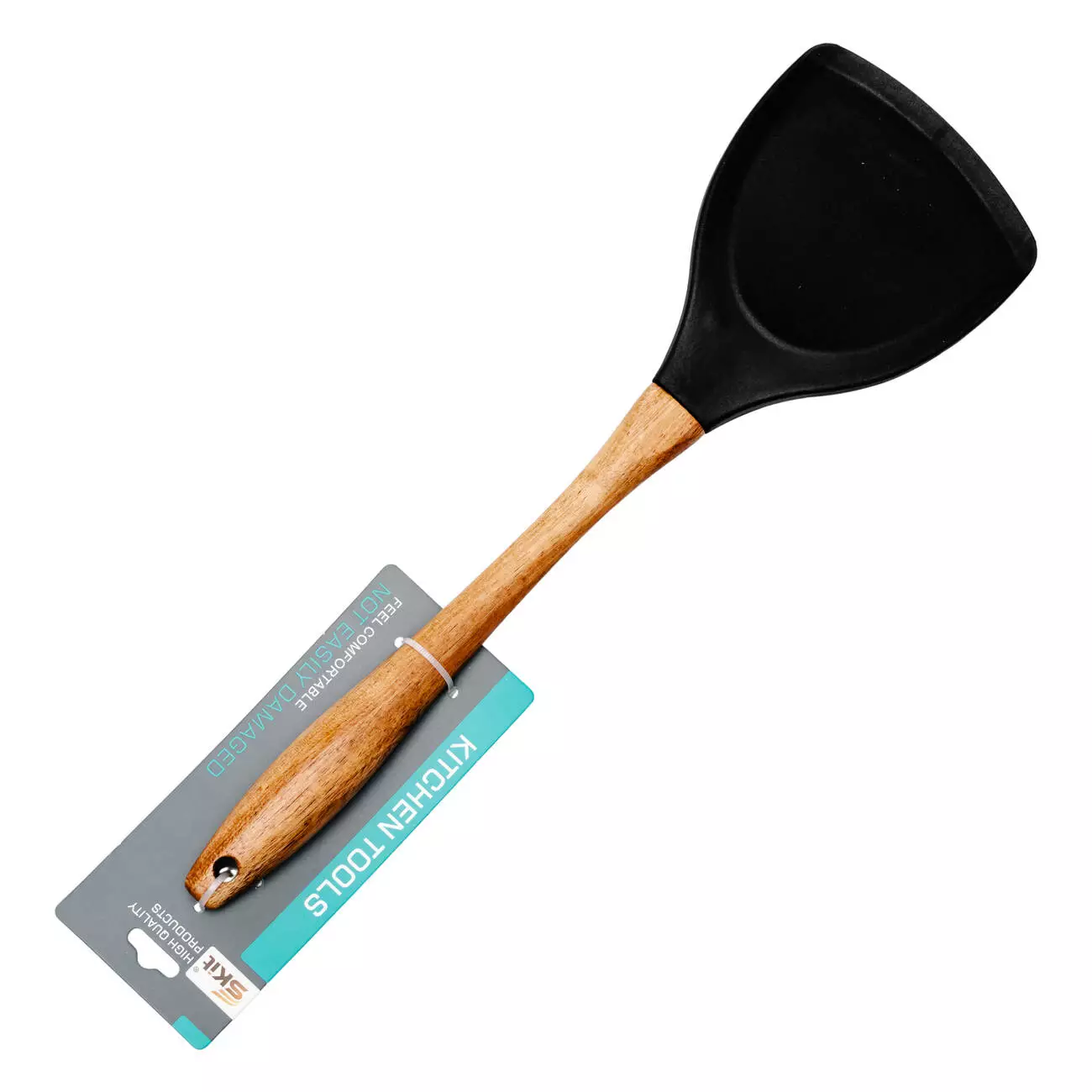 Лопатка виготовлена з харчового силікону, має оптимальну довжину та дерев'яну ручку, що мінімізують ризик отримання опіків. Вона відмінно підходить для посуду з антипригарним покриттям.
