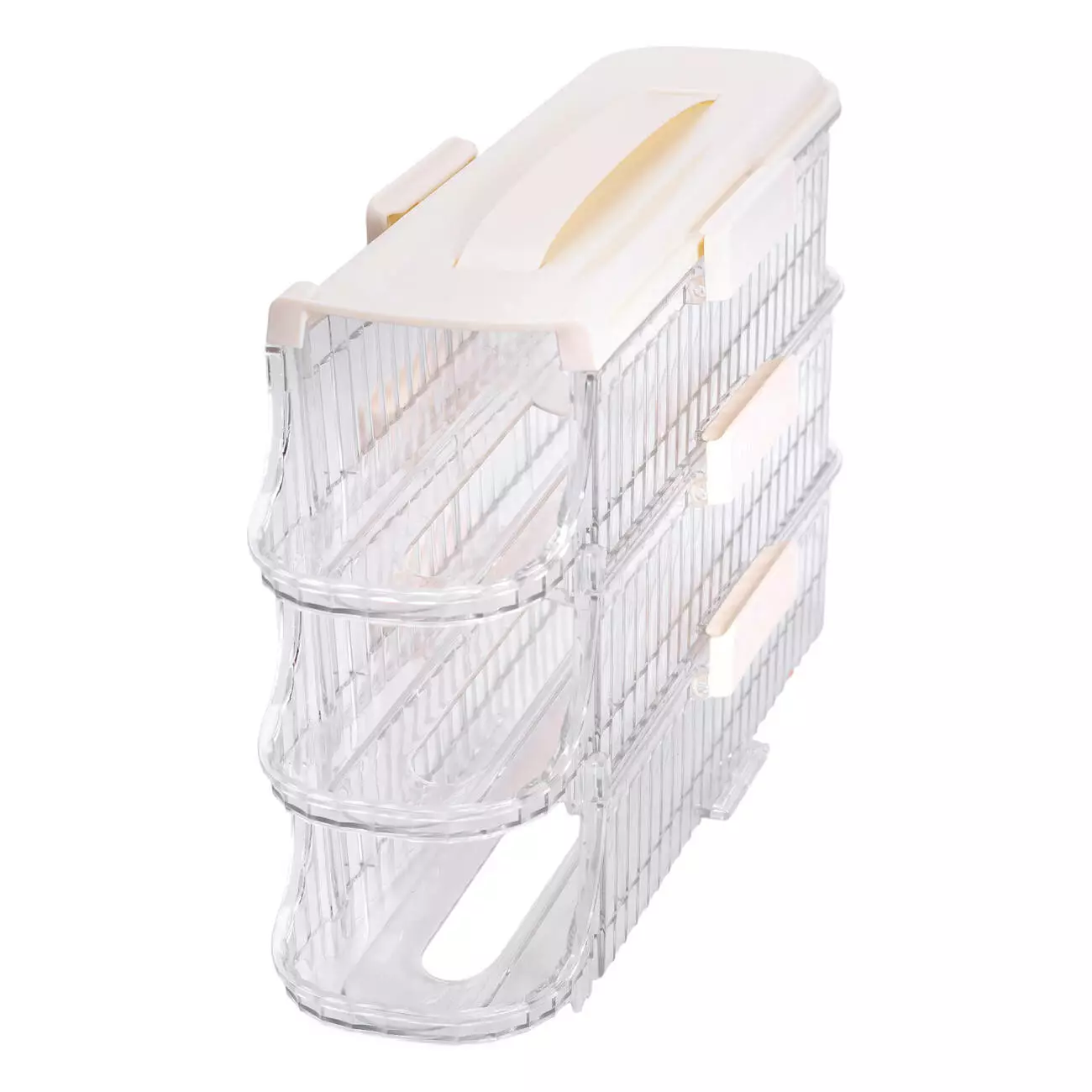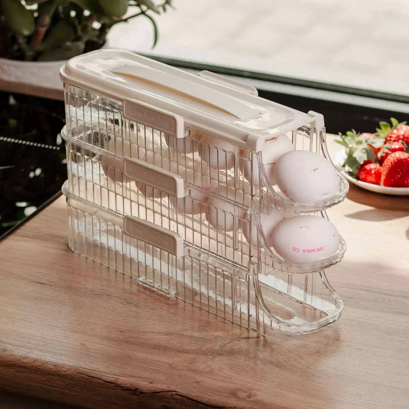 Яруси зручно складаються один на один, утворюючи стійку багаторівневу конструкцію, що дозволяє зберігати більше яєць без зайвого навантаження на площу холодильника. Завдяки прозорим стінкам легко бачити, скільки яєць залишилося, не відкриваючи органайзер. Знімні яруси забезпечують швидкий доступ до будь-якого рівня, що особливо зручно при частому використанні.