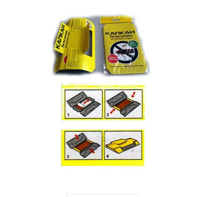 Домик-ловушка для насекомых «Капкан» — универсальное НЕТОКСИЧНОЕ средство для выявления и отлова тараканов, муравьев и других ползающих насекомых. Отличается высокой прилипаемостью, имеет привлекательный запах и не содержит отравы. Клеевая домик-ловушка «Капкан» проста в применении и может быть установлены в любом месте, в том числе в местах хранения пищевых продуктов. Разрешена к применению МОЗ Украины.  Способ применения ловушки тараканов «Капкан»: Аккуратно открыть ловушку и отделить бумагу, закрывающую клей и сложить ловушку. Установить ловушку в местах вероятного скопления насекомых-вредителей и на пути их перемещения. Для достижения лучшего результата рекомендуется использовать несколько ловушек одновременно с расчета одна ловушка на 5-10 кв. м. Ежедневно осматривайте ловушки, если на протяжении 2-3 дней не было поймано ни одного вредителя, необходимо перенести ловушку в другое место. Замену ловушек производят по мере их заполнения насекомыми-вредителями.