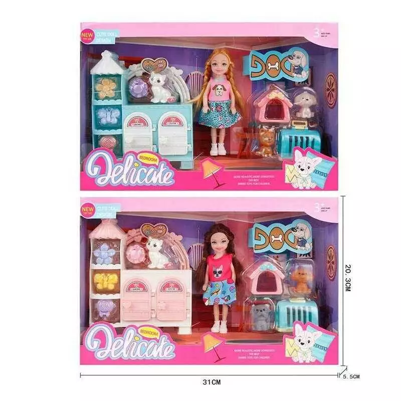 Лялька L 5-37 (96/2) 2 види, 3 улюбленці, будка, переноска, висота ляльки 14см, тумба, двері відчиняються, заколки, в коробці