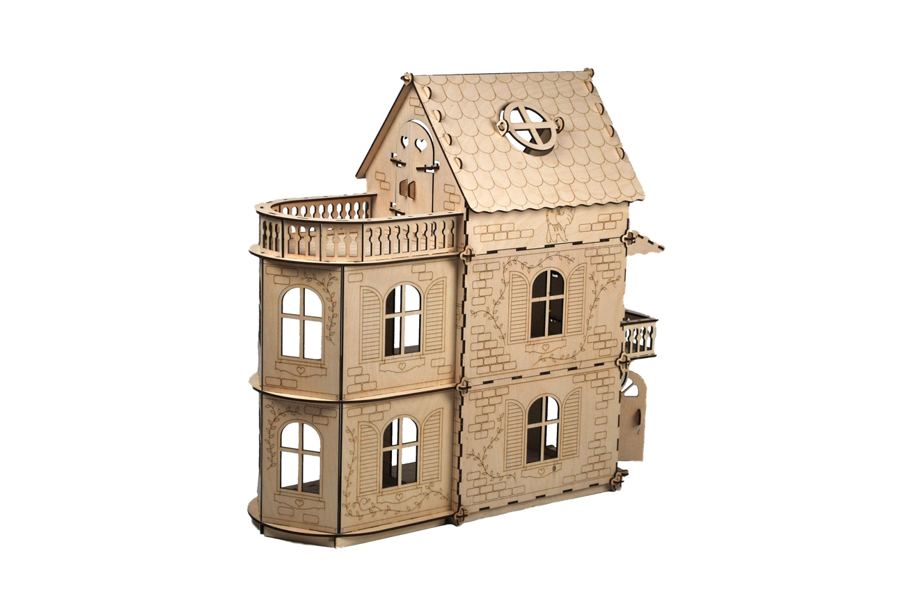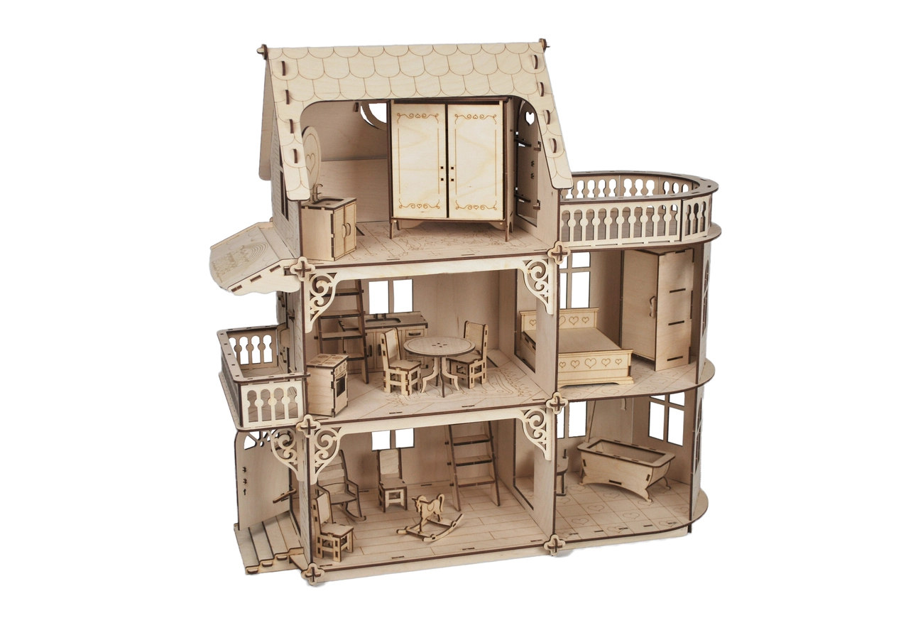 Казка, яка стає реальністю! Для ваших малюків ми пропонуємо лялькові будиночки з фанери. Справжні палаци і замки в мініатюрі - ідеальний варіант для захоплюючої гри. Завдяки деталям і додаткових елементів, дитина разом з вами зможе створити свій неповторний маленький світ, підключений до уяви і ентузіазму! Всі деталі ретельно обробляються, тому вони абсолютно безпечні при грі і збірці дерев'яних лялькових будиночків.Будиночок в комплекті з меблями.