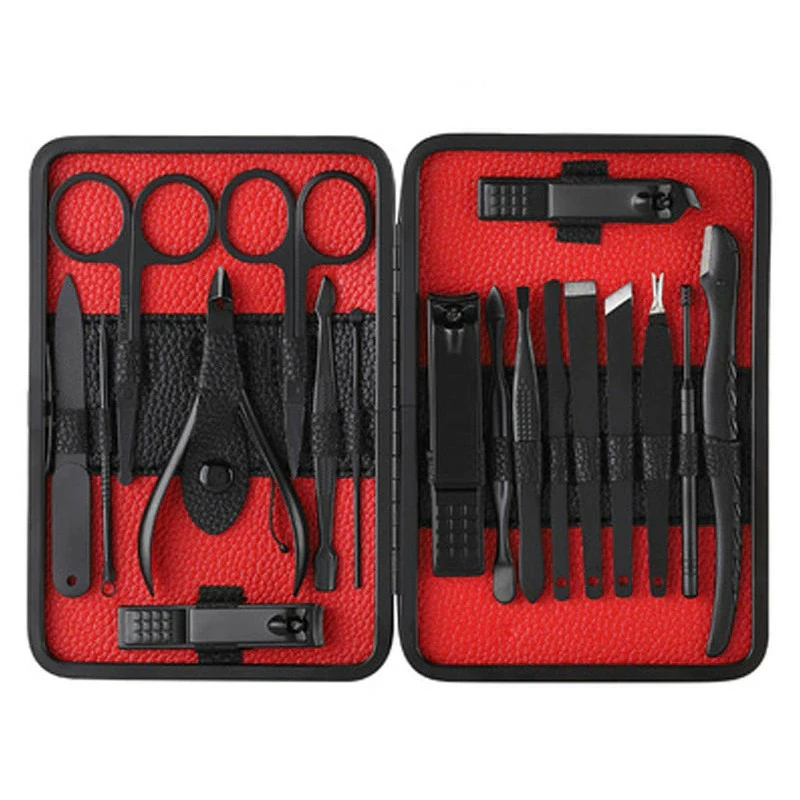 Практичний манікюрний набір у стильному футлярі чорного кольору. Футляр надійно закривається за допомогою щільної клямки. У набір входять якісні та надійні інструменти для акуратного манікюру, педикюру та догляду за обличчям.
