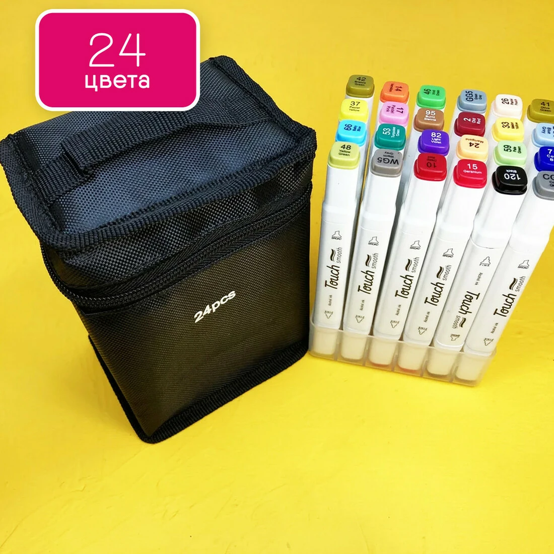 В наборе 24 маркеров разных цветов.