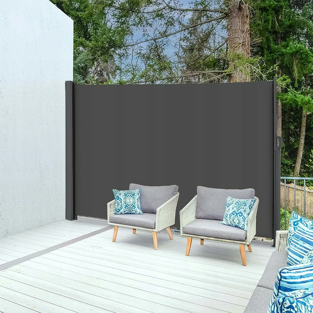Этот боковой тент имеет систему автоматического складывания. Достаточно нажать спусковую кнопку на ручке и шторка сама спрячется в кассету. Это так просто!
