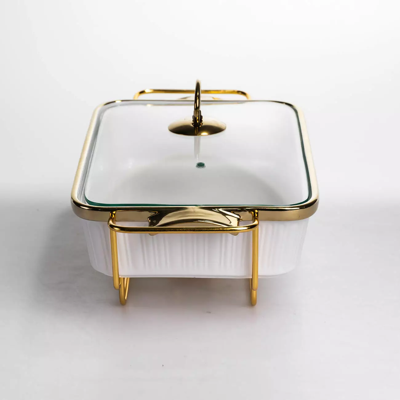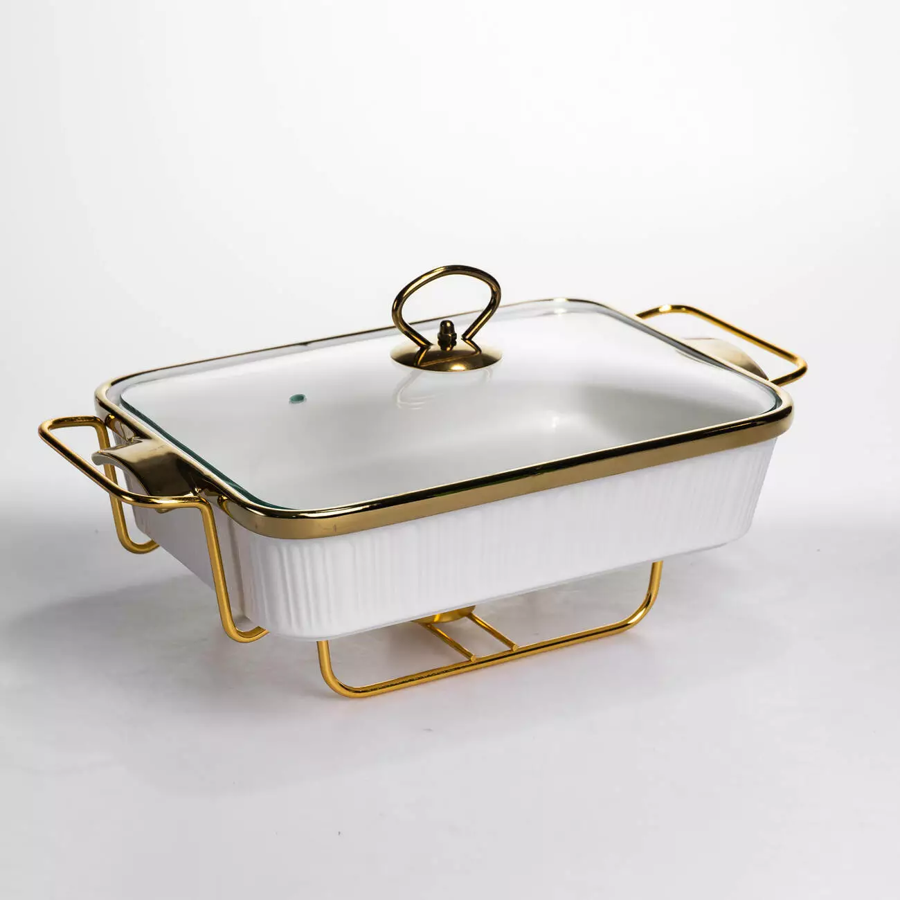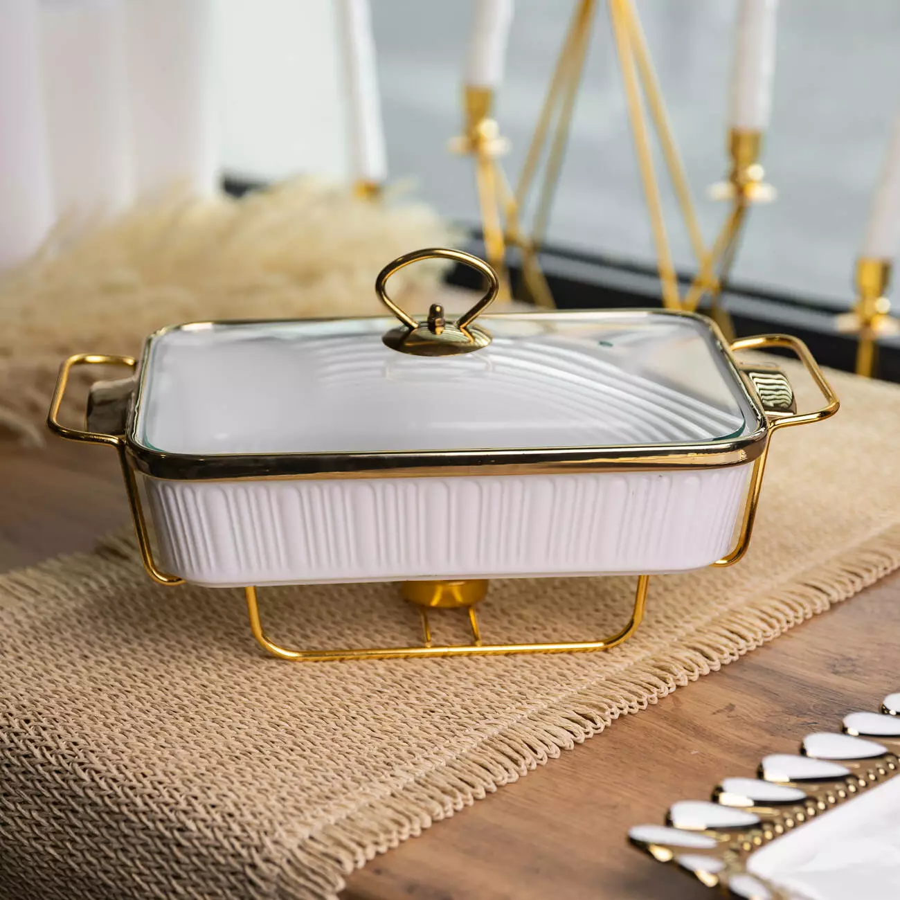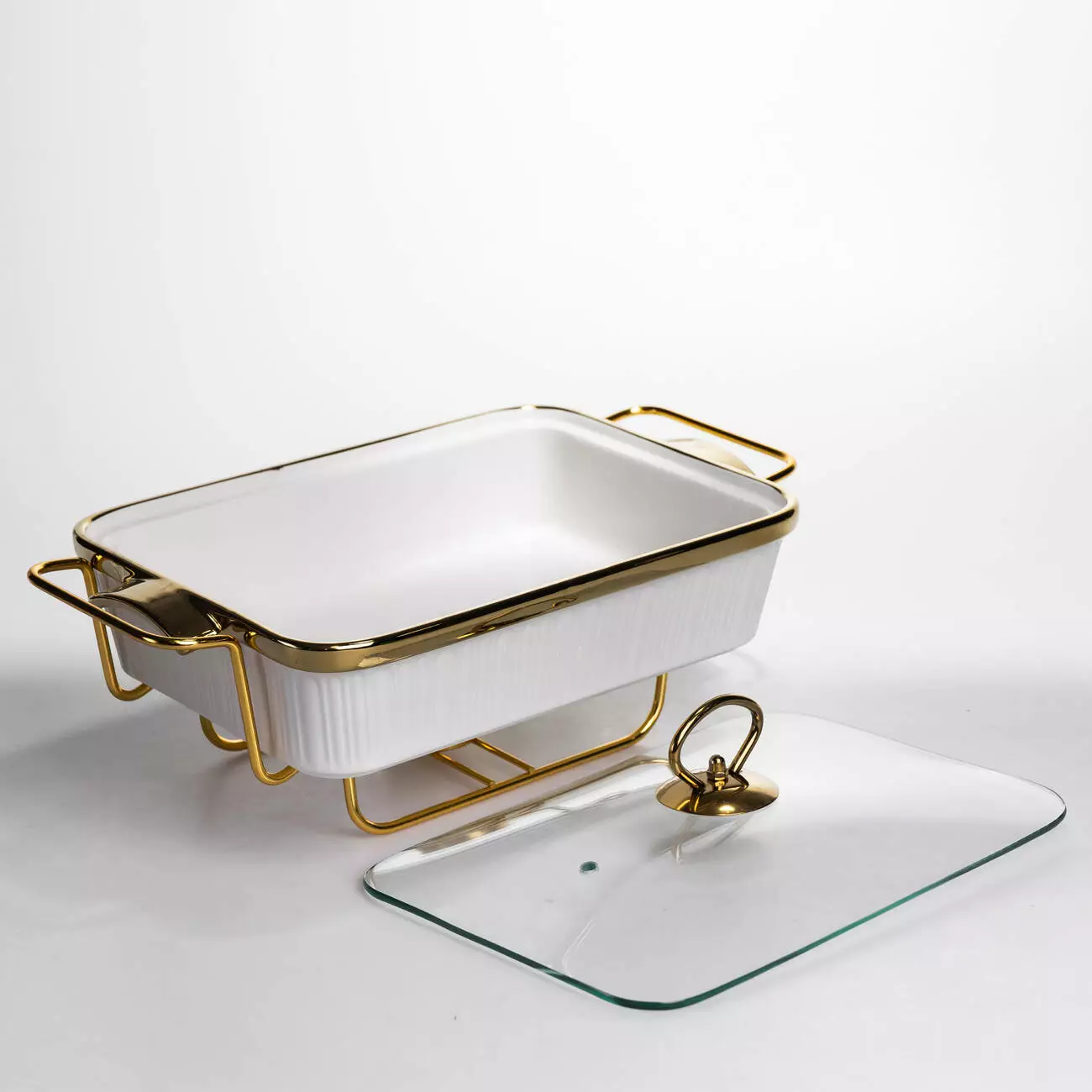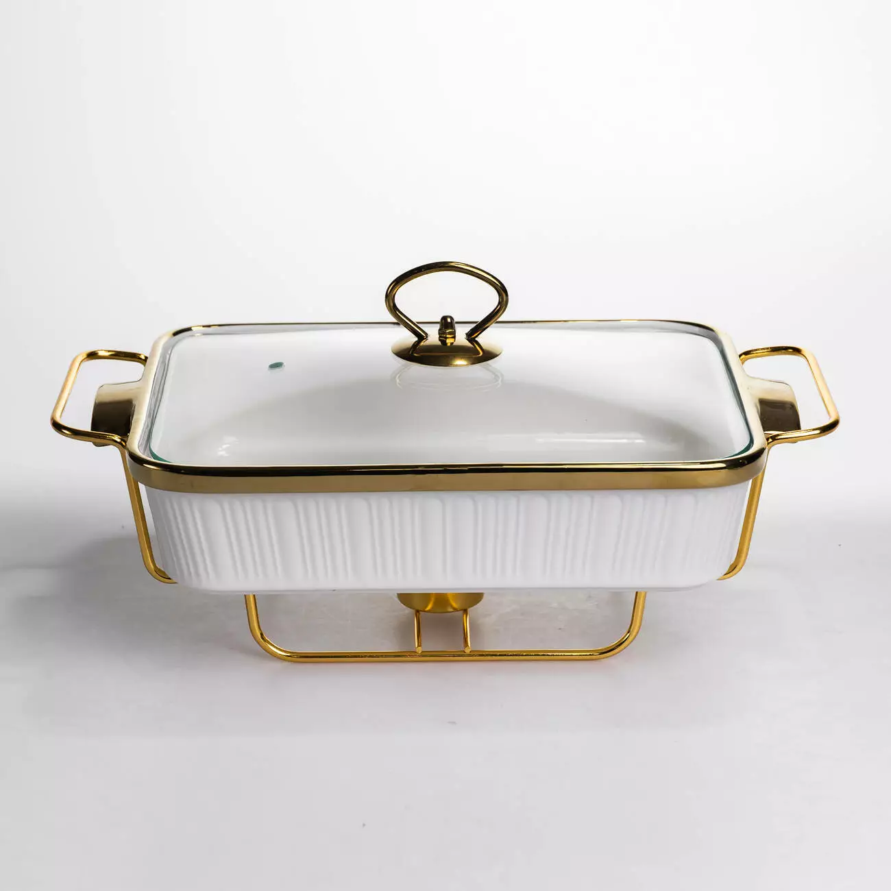 Поєднання порцелянової ємності, скляної кришки та металевої підставки формує практичний варіант для подачі. Виріб легко очищується після використання та підходить для регулярного застосування. Такий формат подачі допомагає організувати стіл більш впорядковано та підтримувати температуру страв протягом усього приймання їжі.
