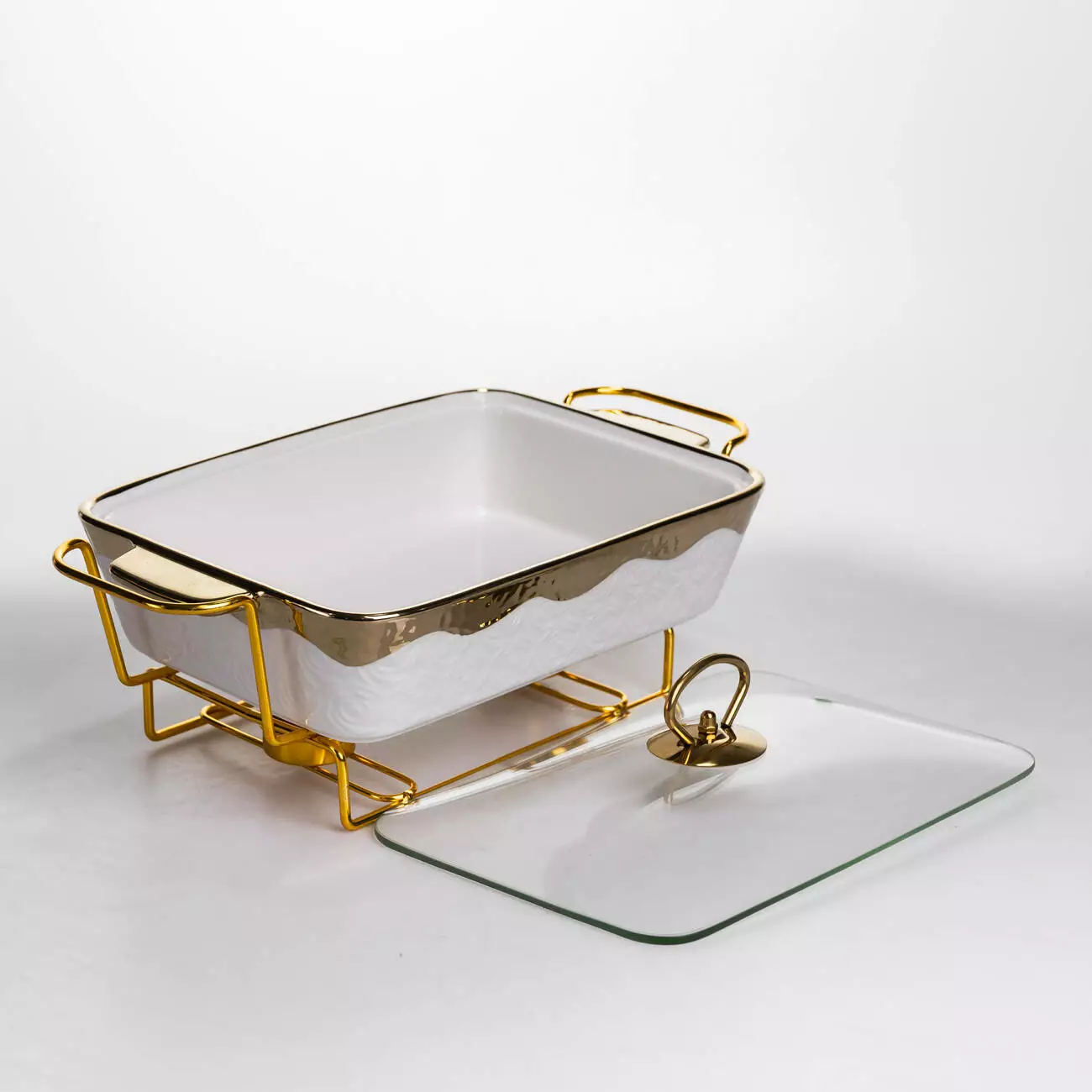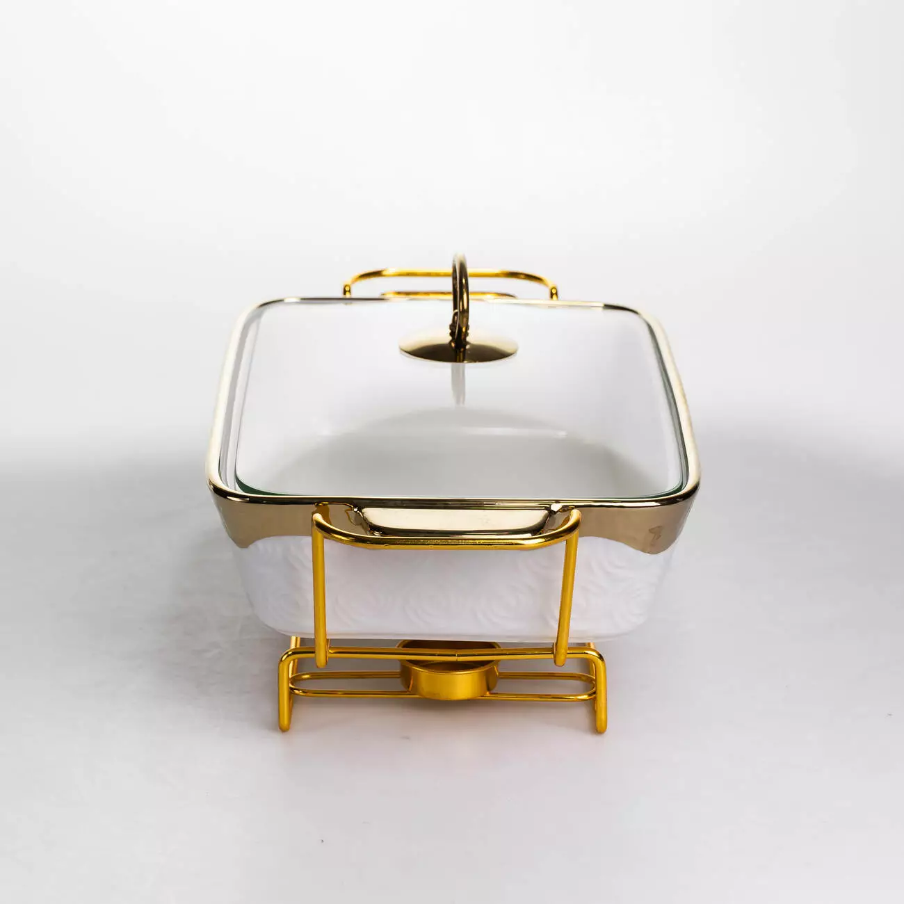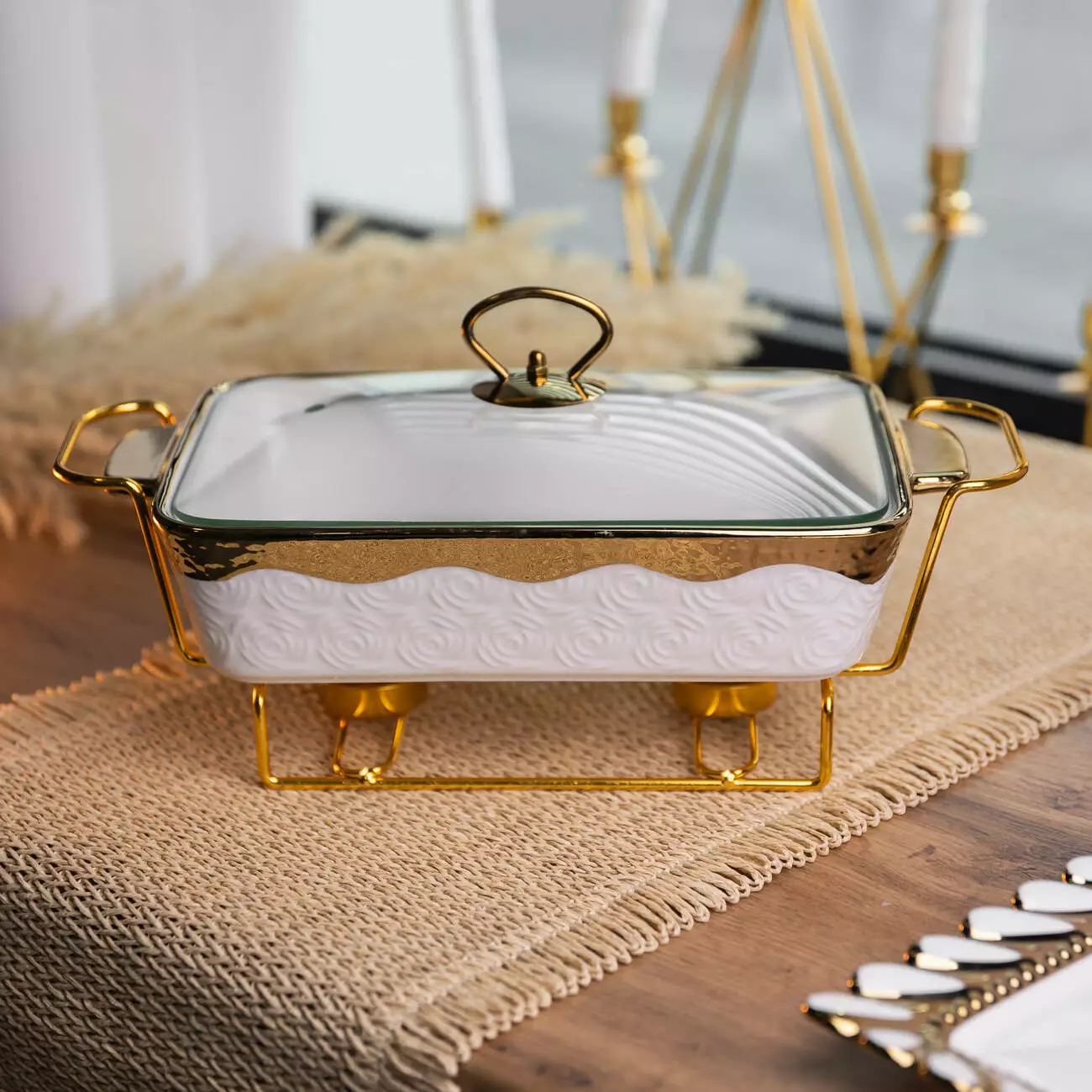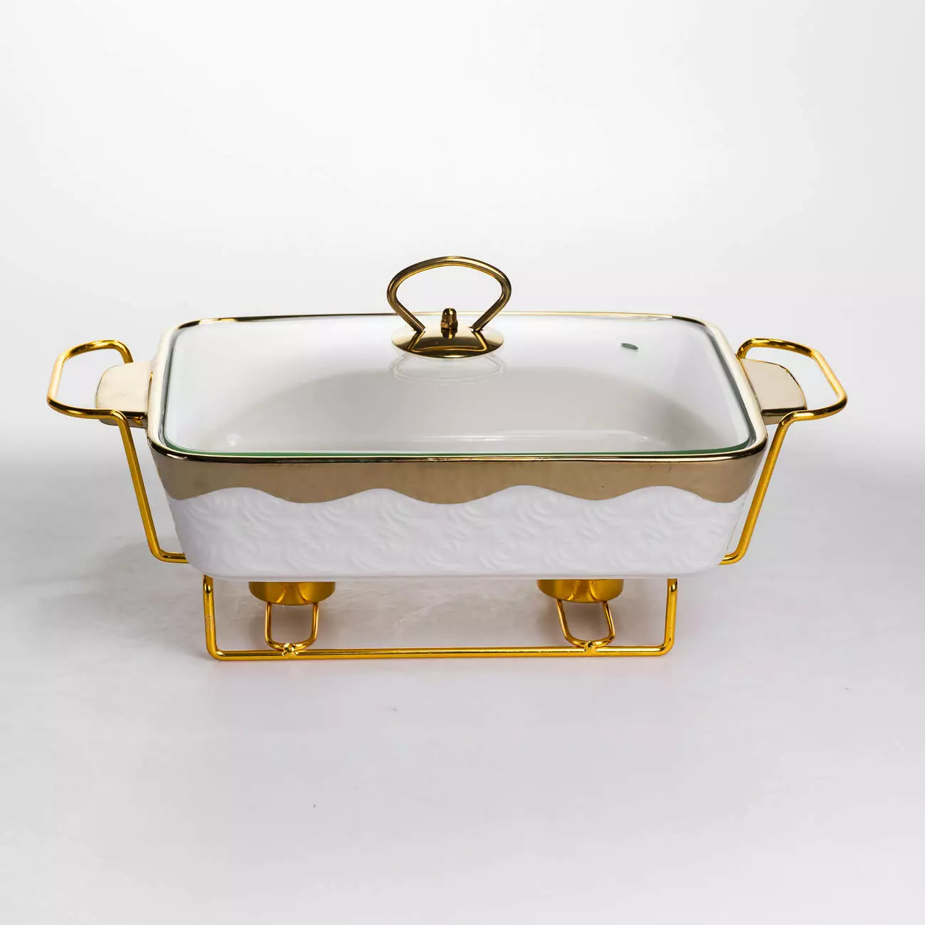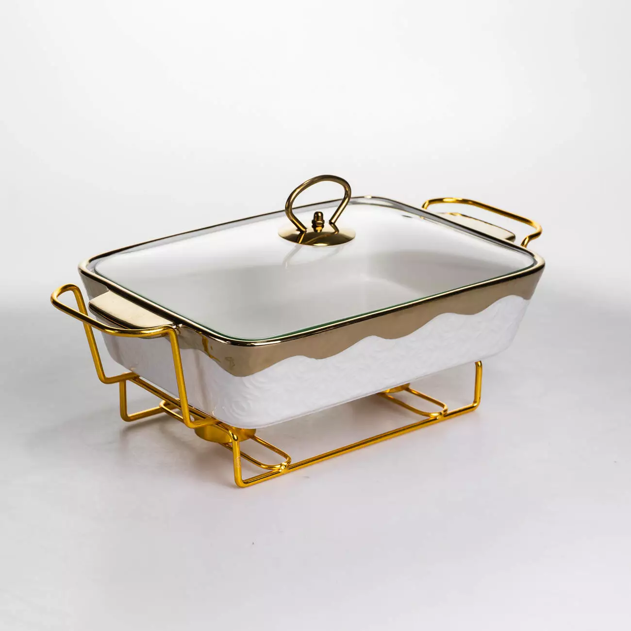 Марміт порцеляновий на металевій підставці з підігрівом — практичне рішення для подачі гарячих страв удома або під час заходів. Завдяки конструкції з підставкою та місцем для свічок-таблеток страва довше залишається теплою без підключення до електрики. Скляна кришка дозволяє контролювати вміст без необхідності відкривати ємність.