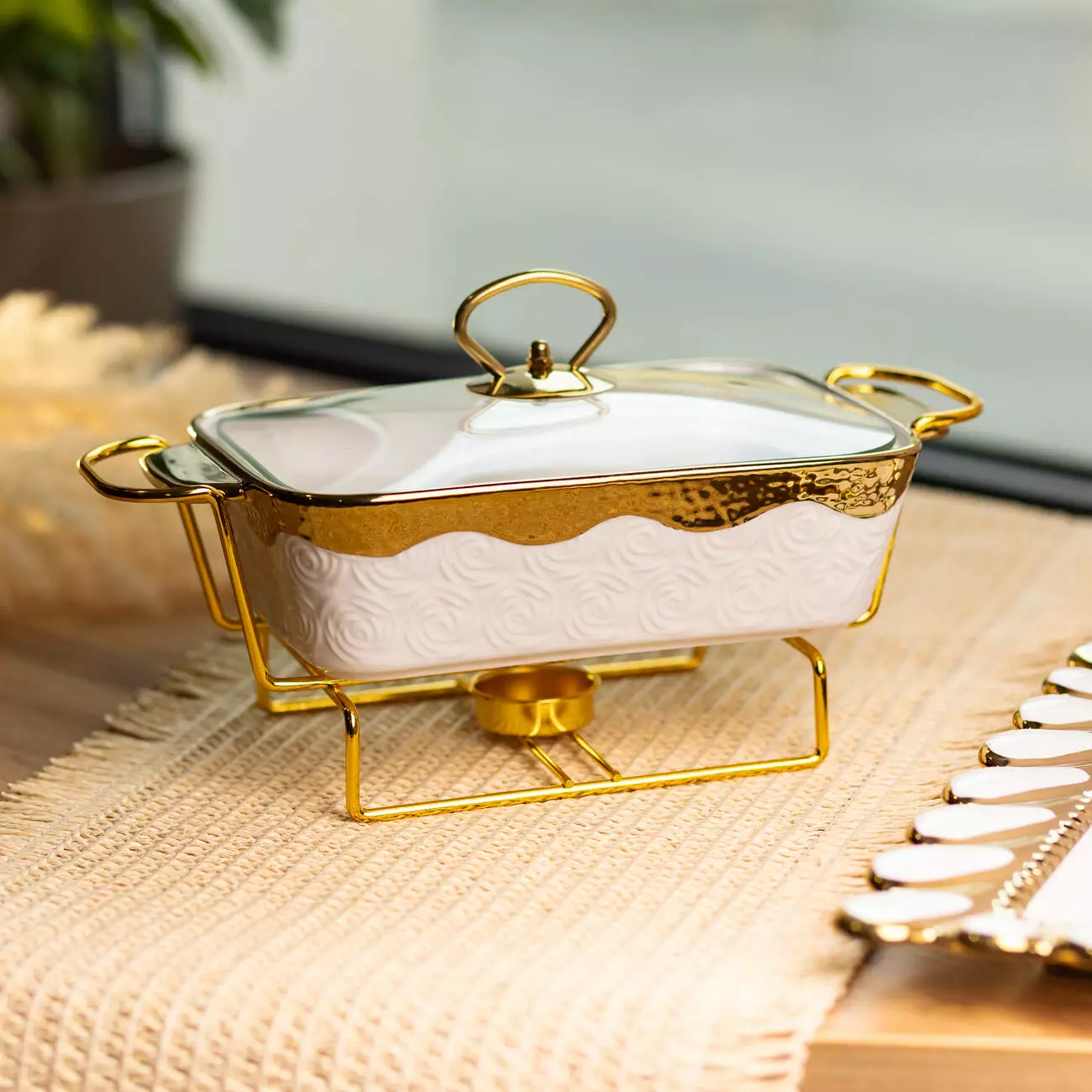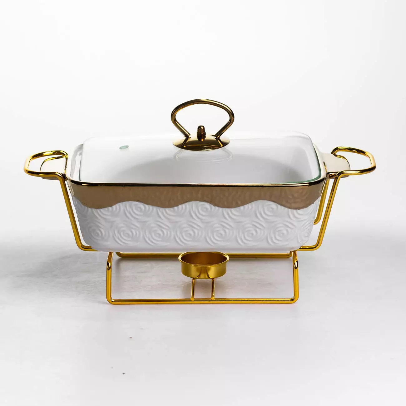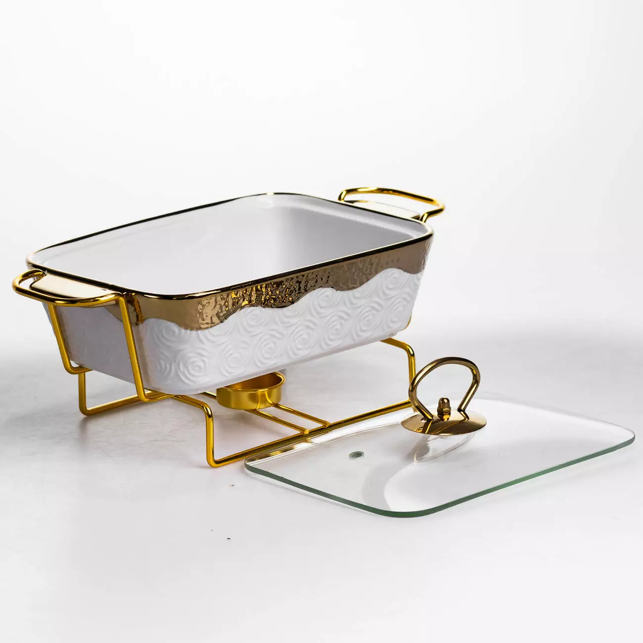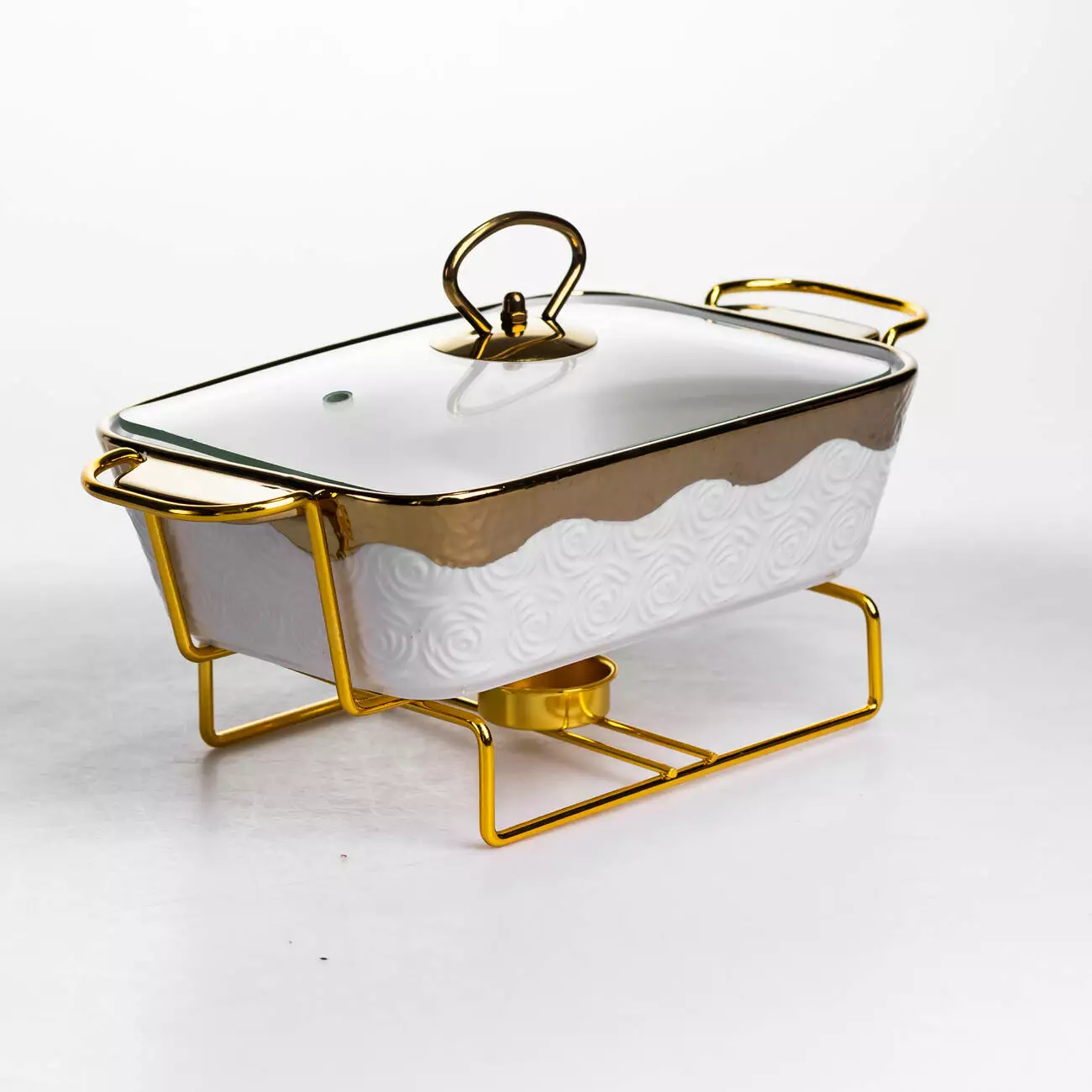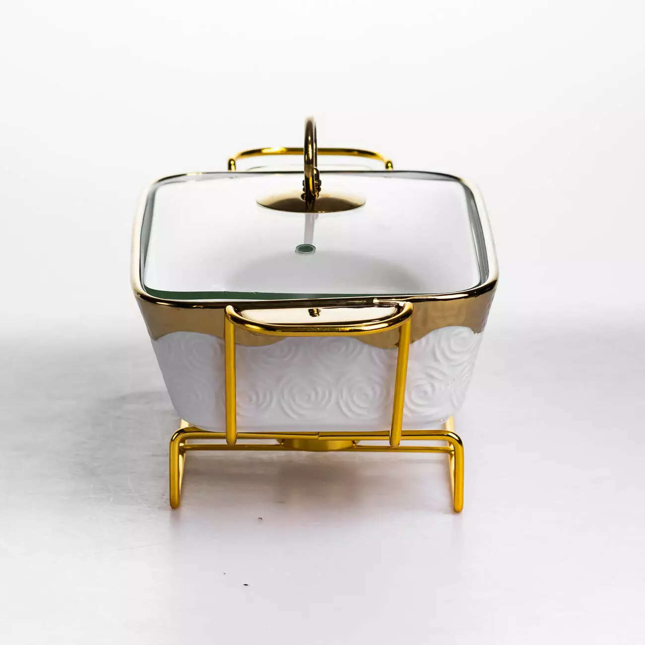 Марміт порцеляновий на металевій підставці з підігрівом — практичне рішення для подачі гарячих страв удома або під час заходів. Завдяки конструкції з підставкою та місцем для свічок-таблеток страва довше залишається теплою без підключення до електрики. Скляна кришка дозволяє контролювати вміст без необхідності відкривати ємність.