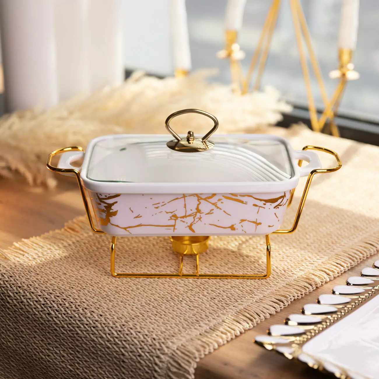 Порцелянова ємність підходить для подачі гарнірів, м’ясних страв або закусок. Металева підставка золотистого кольору забезпечує стійке розміщення та передбачає місце для однієї свічки, яка підтримує температуру страви. Конструкція не потребує підключення до електромережі, що робить її зручною для використання в різних умовах.