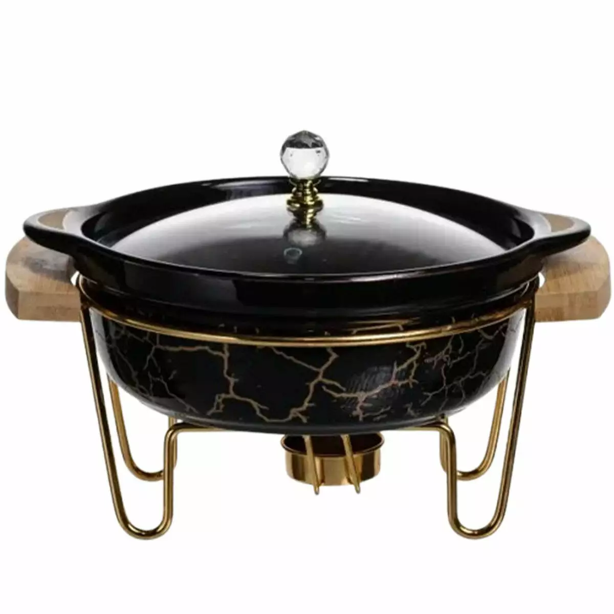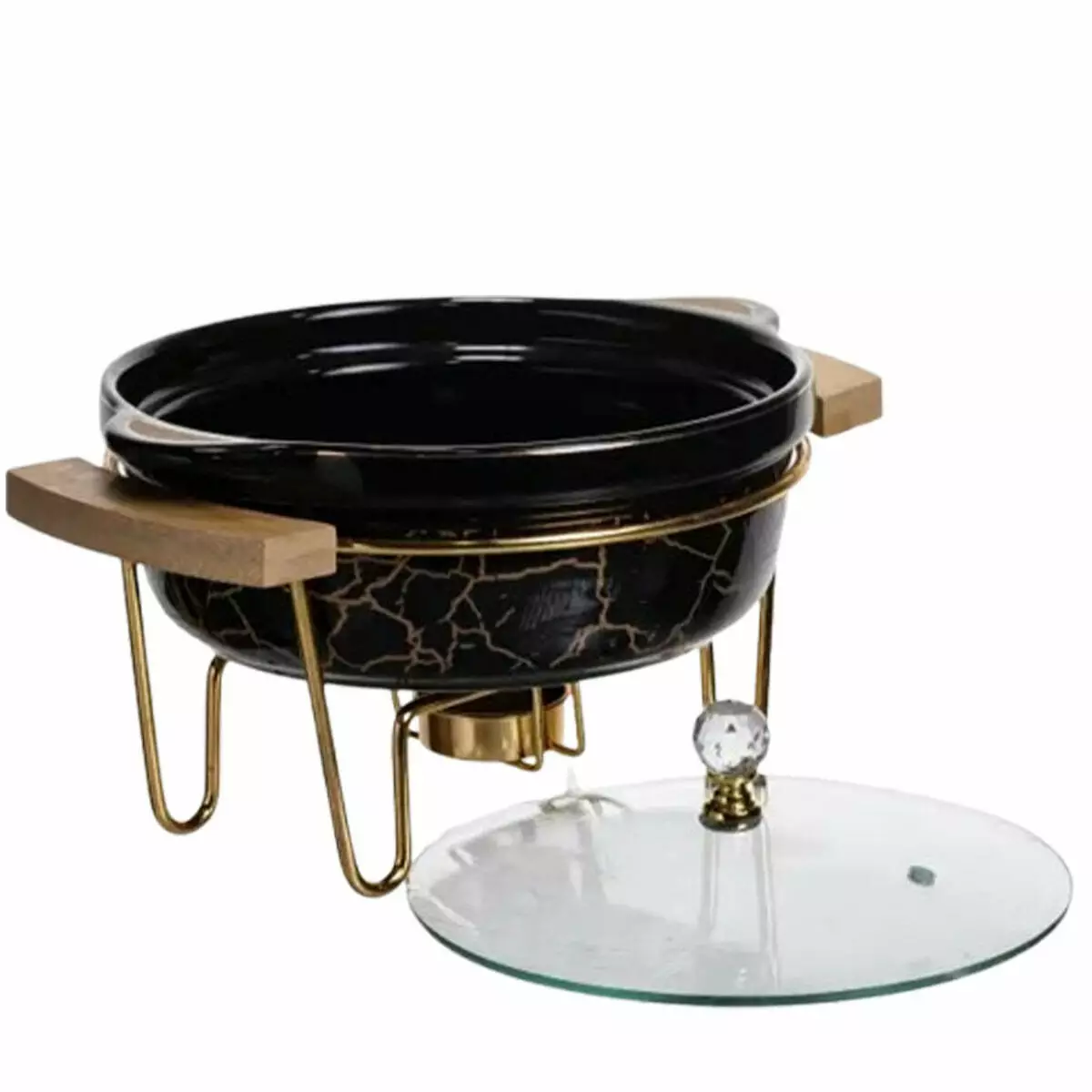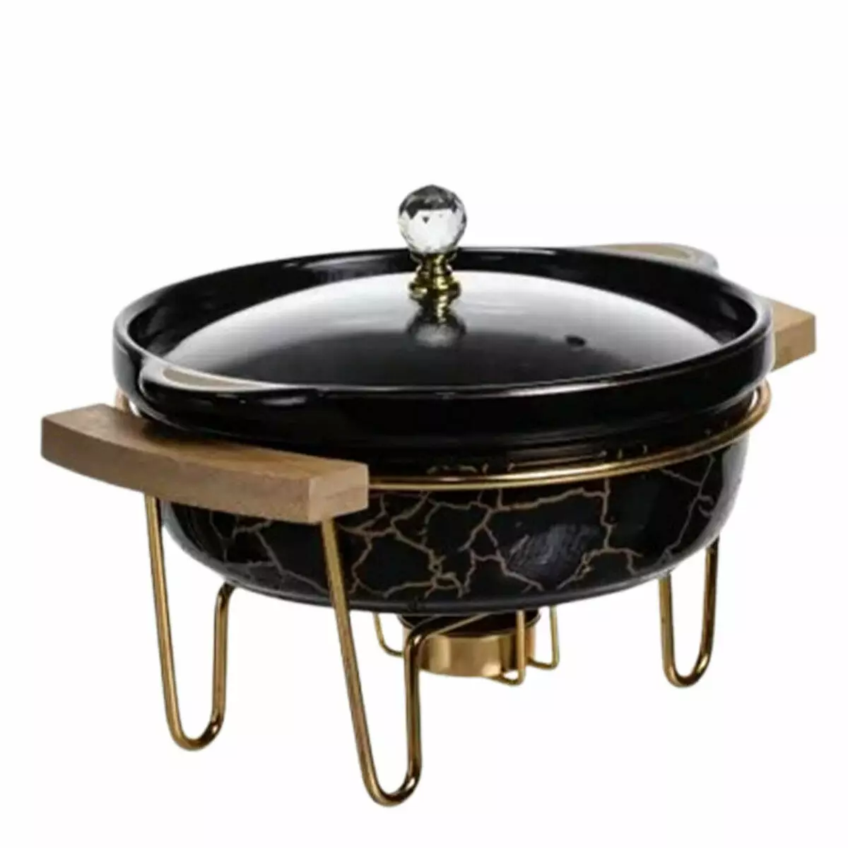 2. Зручність використання: мармітниця має стійку металеву підставку з місцем для пальника (підігріву), легка у складанні та обслуговуванні. Дерев'яні бічні ручки захищають від опіків під час перенесення.