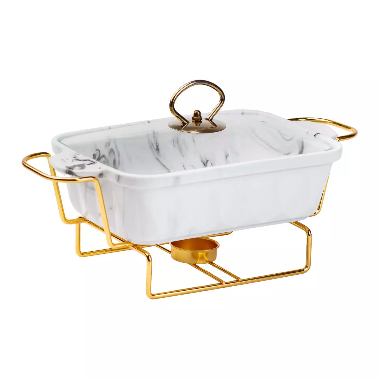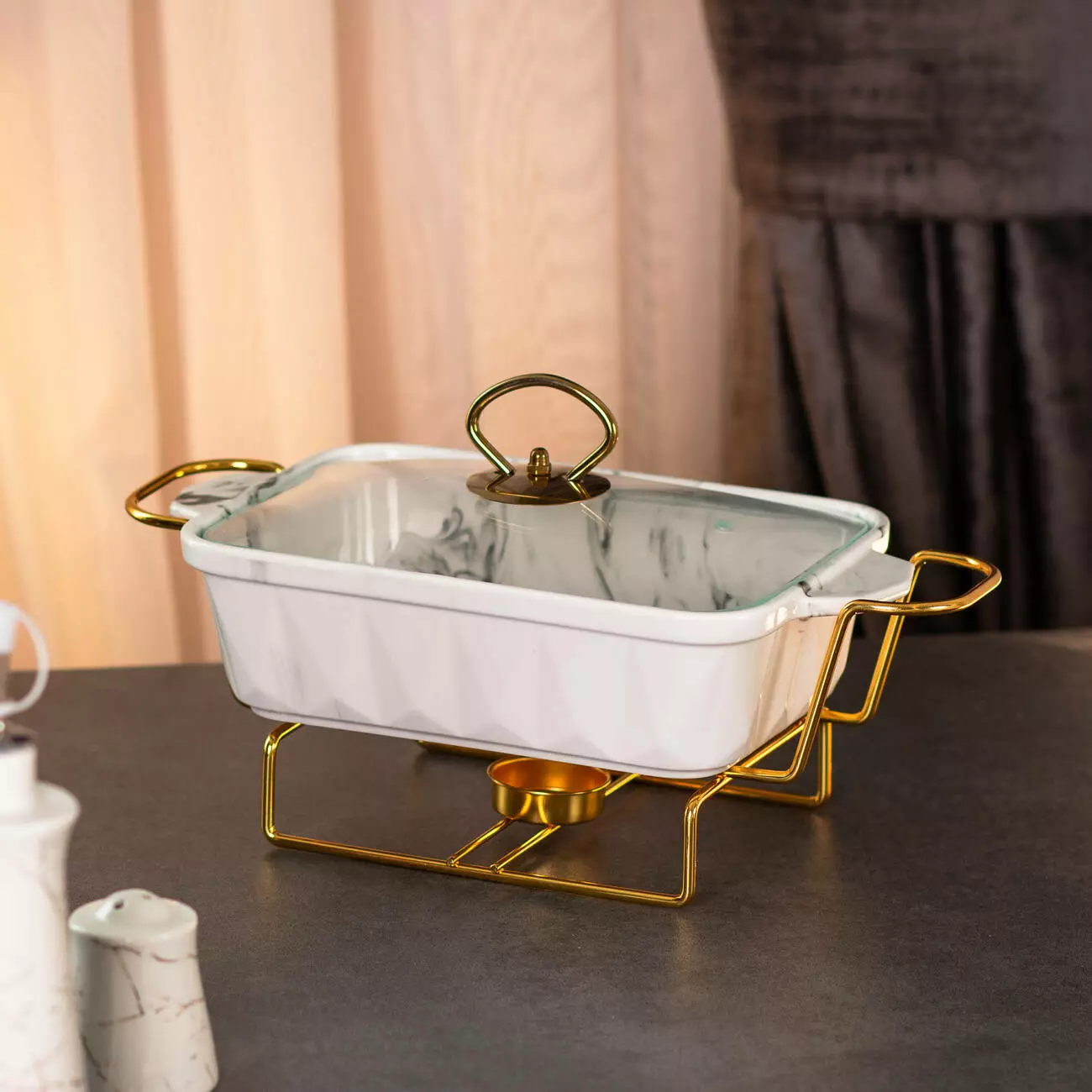 Мармітниця оснащена золотистою металевою підставкою з підігрівом,