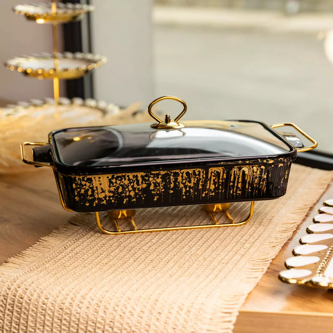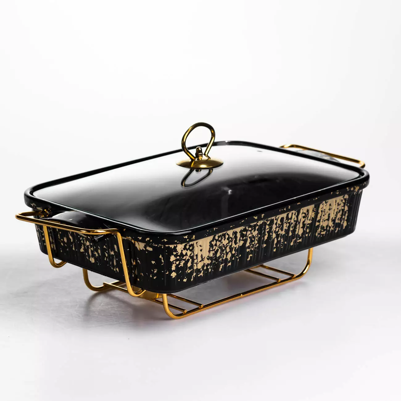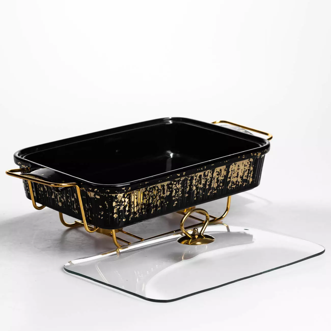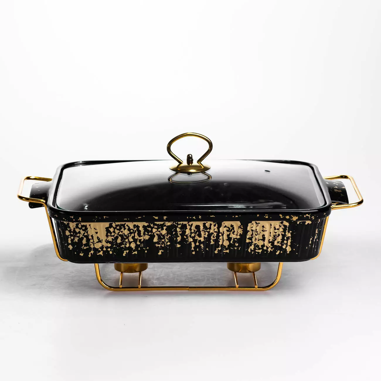 Мармітниця прямокутна 2 л зі скляною кришкою на металевій підставці з підігрівом 40×22,5×15,5 см, чорний