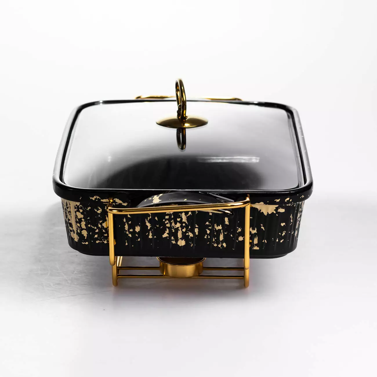 Мармітниця порцелянова чорного кольору об’ємом 2 л забезпечує зручну подачу гарячих страв та соусів на стіл. Прямокутна форма поєднується зі скляною кришкою, що дозволяє контролювати стан страви під час подачі. Золотиста металева підставка додає стабільності і оснащена підігрівом від однієї свічки-таблетки, що допомагає підтримувати оптимальну температуру страви.