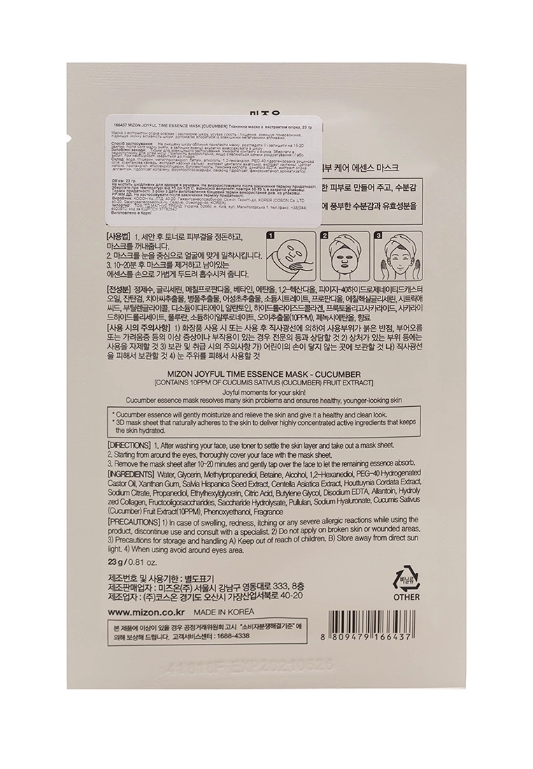 Mizon Joyful Time Essence Mask Cucumber — это листовая маска для лица с экстрактом огурца. Она увлажняет, освежает, тонизирует, оздоравливает и отбеливает кожу, выравнивает её тон и улучшает цвет.