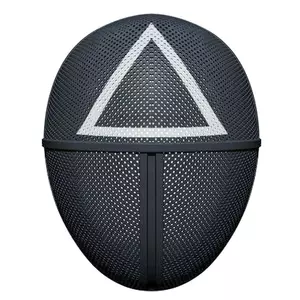 Маска з Ігри в Кальмар з трикутником виготовляється з міцного, легкого пластику, який не викликає алергічних реакцій. Модель легко вдягається та надійно фіксується на голові користувача. Лицьова сторона виробу виконана у вигляді сіточки, що дозволяє приховати особу, при цьому відкривши широкий огляд. Трикутник свідчить про те, що гравець – охоронець, який стежить за дотриманням правил та контролює ігровий процес. Ця маска дозволить гравцям весело провести час, імітуючи «ігри в кальмари» разом із друзями, проходячи всілякі випробування. З такою маскою можна вигадати безліч ігор або відтворити костюм з улюбленого серіалу.